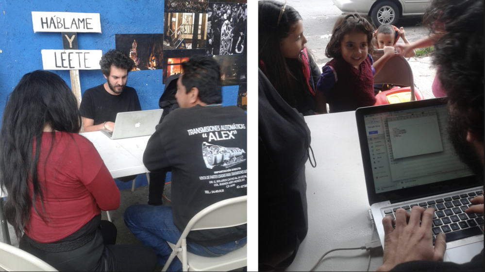 Earthquake (2017). On September 19, 2017, an earthquake struck Mexico City. The earthquake took place on the same day as the terrible earthquake of 1985. During the following days I set up a table with a computer and the backpack printer in different boroughs of the city, with signs that read: “Memory Collection,” “Talk to me and read yourself,” “Print your voice for free,” “Self-journalism,” “The present is confusing.” People spoke to me, I transcribed their voices and read the text aloud to them in that same moment. They took as many copies as they wanted to spread their words.