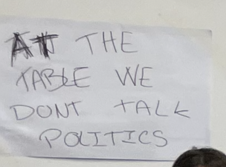- A meal framed by the phrase, “At the table, we don’t talk politics.