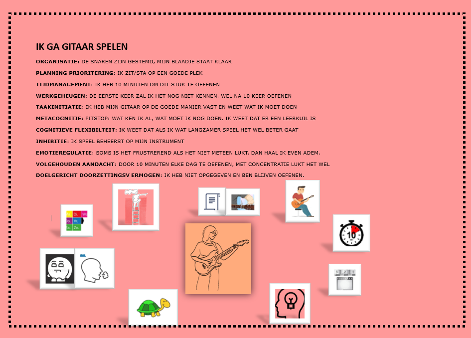 Dit onderwerp neem ik mee in de workshop en in het naslagwerk. Ik heb ook een “vertaling” gemaakt naar de werkvloer, hieronder te zien. In dit geval heb ik de autometafoor gebruikt om een poster te maken van het gaan spelen op de gitaar. Wat is daar allemaal voor nodig.