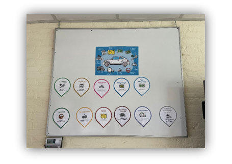 In de v.s.o. klas van dezelfde school hang dit bord vooraan in de klas. Het is dus continu in het blikveld van de leerlingen. De leerkracht reflecteert hier regelmatig op.
