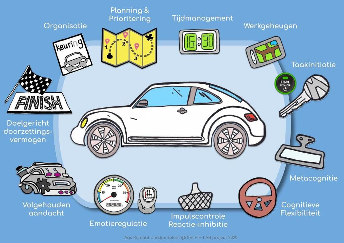 Omdat je tijdens een muziekles heel veel zaken die te maken hebben met de Executieve Functies ziet gebeuren bij leerlingen, kun je daarop inspelen. Een manier om het gedrag leerlingen te spiegelen aan de hand van de executieve functies is het gebruiken van de auto-metafoor. Dit wordt in een aantal scholen waar ik werk gebruikt. Wat ik de leerkrachten regelmatig hoor zeggen is bijvoorbeeld in een les: "trap op je rem". De leerlingen snappen wat ermee bedoeld wordt en kunnen ze het toepassen. Voorbeeld uit de praktijk: ik zei tegen de klas nadat we een oefening hadden gedaan waarbij ze moesten bewegen op muziek dat ze nog moesten blijven staan in plaats van gaan zitten op hun stoel. Een jongen (M.) was al onderweg naar zijn stoel maar draaide om. Vol trots zei hij tegen de juf: ik trapte op mijn rem!”. Hij had zelf de situatie herkend en er woorden aan gegeven.
