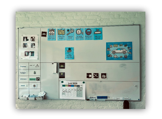 Met picto’s aangeven welk onderdeel van de muziekles bezig is (zingen, dansen, luisteren).
