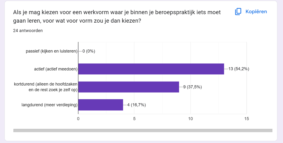 Een aantal leerstijlen vormen een basis voor het maken van de workshop. Het ervarinsgericht leren, zoals ik zelf heb gedaan bij de training van het ABC-circuit heb ik verder toegelicht. Ik heb een enquête uitgezet en de uitslag hiervan geeft aan dat men het liefst kortdurend met een actieve werkvorm leert.
