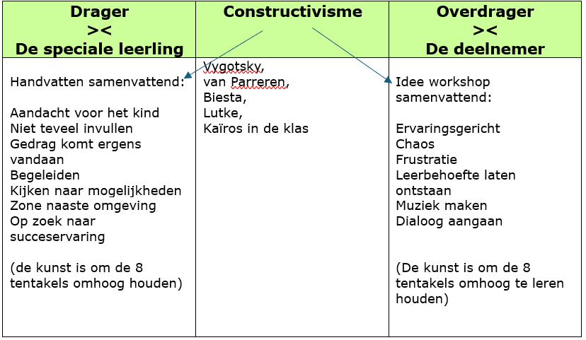 Door het gaan denken in de termen van drager naar overdrager (Robin Brugman, onderzoeksbegeleider) ben ik gaan nadenken over wat dit voor mij in deze situatie betekent. Ik ga uit van mijn beroepspraktijk: muziekdocent in het s.(b.)o. naar een workshopleider die anderen op weg wil helpen om in deze vorm van onderwijs les te geven. Dit breng ik hieronder in beeld: