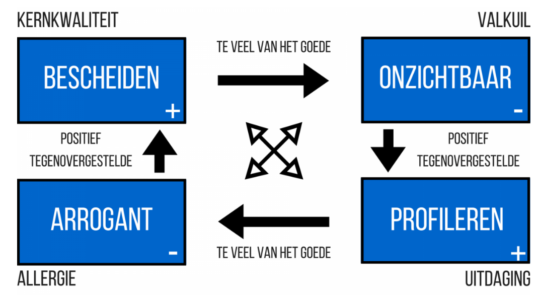 Kernkwadrant is een model waarmee je sterke en zwakke punten in beeld kunt brengen. Door het formuleren van een kwaliteit van jezelf kun je er ook achter komen wat je valkuil dan is. Bijvoorbeeld: Als je heel consequent bent (kwaliteit) kan je valkuil zijn dat je star bent. Vervolgens kun je daar weer tegenover stellen dat je allergie dan kan zitten bij iemand die alle winden meewaait. En dan kun je je uitdaging formuleren: proberen meer flexibel te zijn.