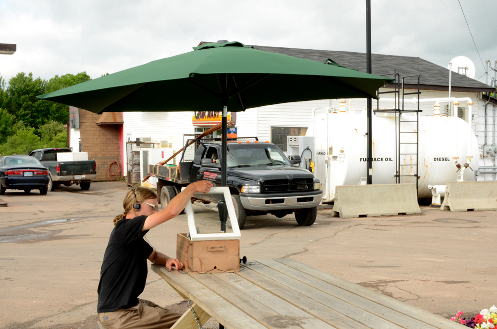 Installation of newspaper inside and outside locations for The Invisible Inside the Visible at Meh's gas station and convenience store, River John, Nova Scotia, 2012. Outside location had audio of directions installed.