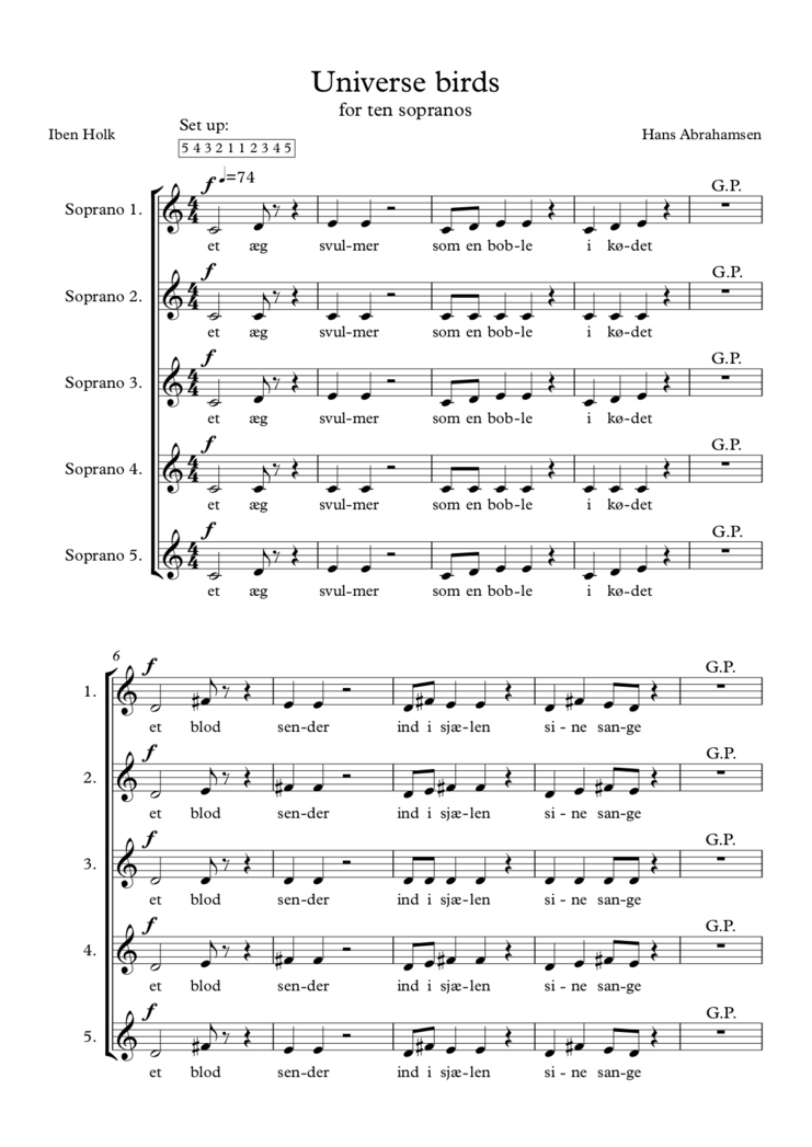 In 2016 I was asked to conduct a piece by Hans Abrahmsen - a great opportunity to perform for the composer himself as a star guest in the festival dedicated to his pieces. We decided to name the ensemble after the piece - thus the ‘Universe birds’ ensemble was born. I had to choose my singers from school, and as the piece was written for 10 sopranos, which is the voice type that we have the most of, I could gather a great group of singers. I made a digital score of the piece with the permission of the composer for better legibility. I looked for the most efficient methods to teach the pseudo-canonic structures to the sopranos (as the musical material is spread around in space in a double quintet). All participants and the composer himself were very happy with the collaboration and how the piece sounded in the final concert. The leaders of both the Singing and Composing departments were also very enthusiastic about my coaching and based on this working process they asked me to make a project connecting the two departments in 2017.