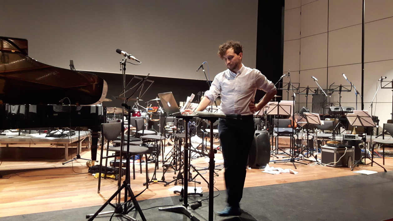 For example: in Patrick Giguère’s piece, Some fantasy, a strong contrast was required between a very soft legato homophonic texture in the vocal ensemble, and a massive sound in the orchestra. We ended up changing completely the position of the singers, standing in front of orchestra and singing unamplified.