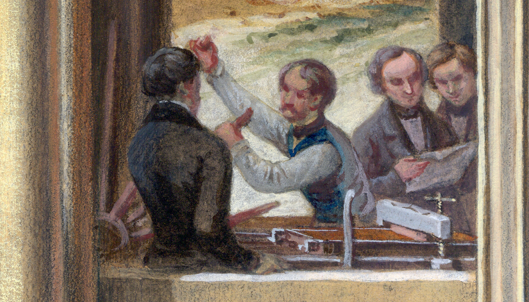 Depicting the printing press partially, a technician moves the wheel while talking to a woman. Two men stand behind, analyzing what appears to be a printing proof pulled from the press.