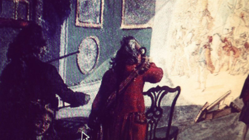 The impulses that pointed me in the direction of performance comics came quite early in the artistic research project. In November 2012 I attended a storyboard course for directors at the London Film School. There the instructor Dylan Stone talked about the magic lantern tradition, which can be seen as the forerunner of film and TV. He introduced me to an old painting of a magic lantern session and explained how the lantern worked. It was an epiphany for me, a turning point when I realized that the concept of comics on screen had existed long before computers and film, approximately as early as 300 years ago. This gave the screen more existential weight than the computer itself, and the concept of screen-based comics gained new meaning for me. (Read more about the concept of screen-based comics in chapter 4, the section ‘Fundamental Parameters of Digital Comics’.)