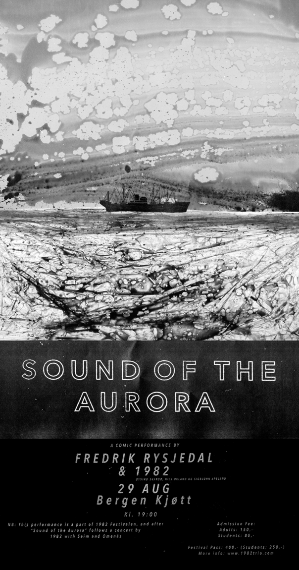 The premiere of Sound of the Aurora was on 5 June 2014, in the drawing hall at Bergen Academy of Art and Design. The impro-musicians in 1982, Nils Økland, Øyvind Skarbø and Sigbjørn Apeland, made the live soundtrack for the performance.