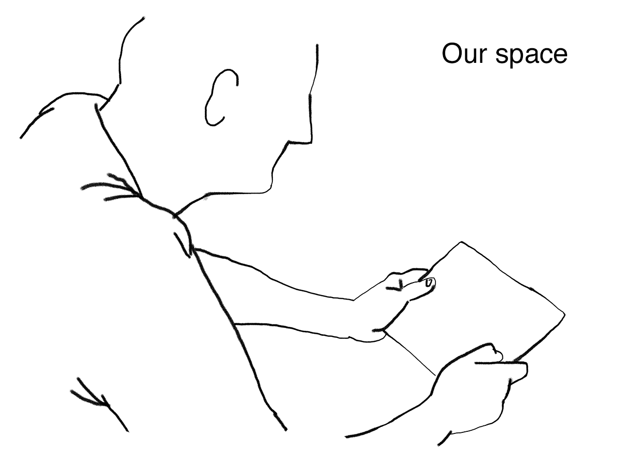 When making Sound of the Aurora, my focus was not on spatial motion at all. My biggest concern at the time was to decide whether I should continue making comics with a full screen panel or whether I should use a panel layout. My second turning point came the day after my first performance. I realized that a single-image presentation form is suitable for communicating with crowds. The overlapping images that I later called ‘cinematic panels’ keep the audience’s focus within the same frame. This full-screen format therefore had relevance, and the fact that the relevance related to performance made it a constructive finding. I therefore continued working with a full-screen panel when creating Close, Closer, Closest, and with performance in mind. Although I had this experience while making Sound of the Aurora, I have chosen to write about it in chapter 3 where I address cinematic panels.
