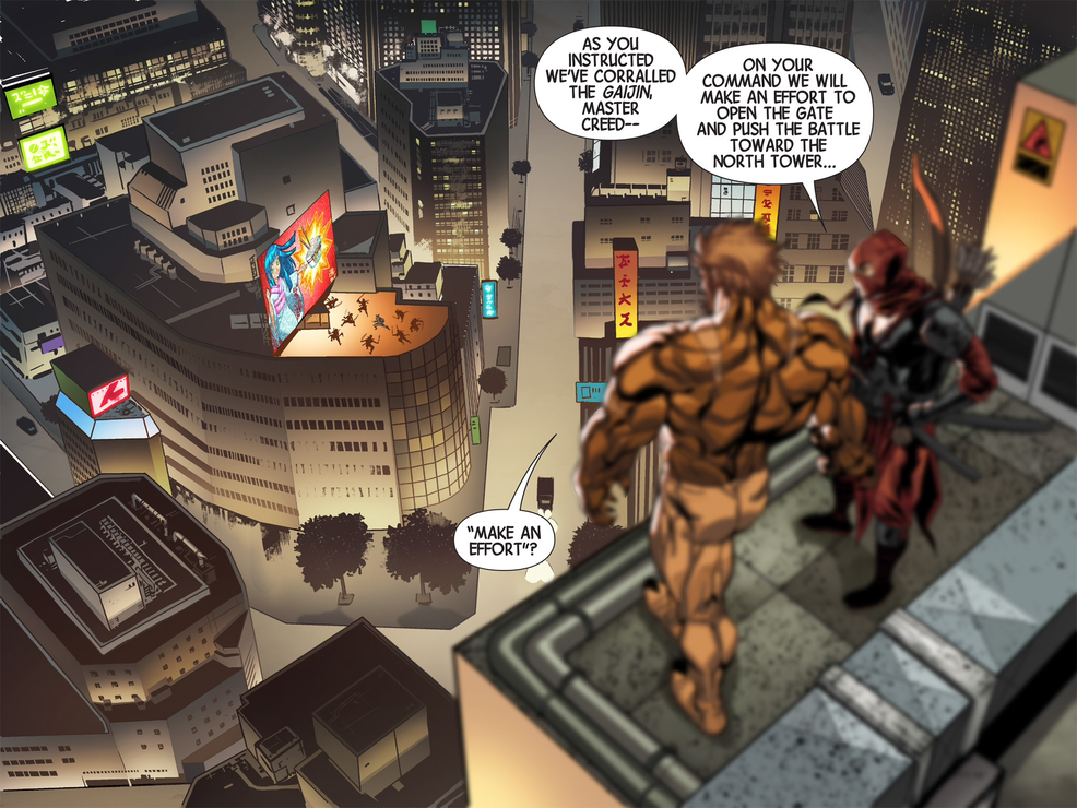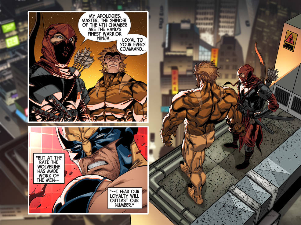 Panel delivery 1: Marvel's Infinite Comic, Wolverine: Japan's Most Wanted – Issue #1 is a comic that use panel delivery and cinematic paneels. It also use focus effects in the images, separating fore- and backgrounds. Click on the arrows to see two frames of this panel delivery. The frames are from page 12–13.