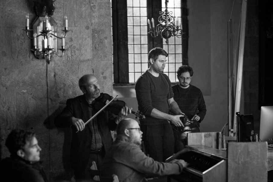 Picture 12: Handeling the Occulus Rift VR-Goggles as sensors to move the mobile frame in the 3D edition of Sound of the Aurora. Here from my performance in Mariakirken (St. Mary's Church) in Bergen in 2016. From left: Stephan Meidell, Nils Økland, Sigbjørn Apeland, Fredrik Rysjedal and Aslak Helgesen.