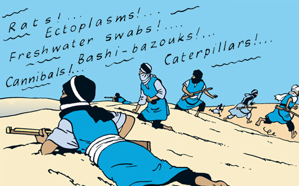 Picture 14: This is a panel from The Adventures of Tintin - The Crab with the Golden Claw (1943) by Hérge. The panel shows seven soldiers, but they are composed to be read as a sequense that shows the motion of getting up and start running.