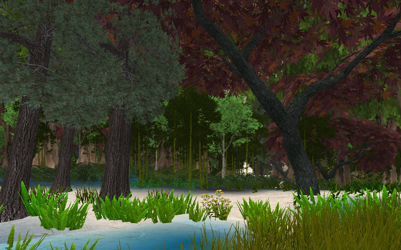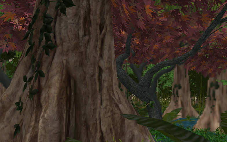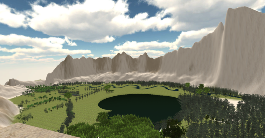 Picture 16: During the performance, Gro controlled the camera with keyboard controls from her computer. She could walk freely a round in the environment, like if it was a first person computer game. The frame moved down from the mountain and into the forest. Characters where placed at different locations in the environment, and she seeked them out during the performance.
