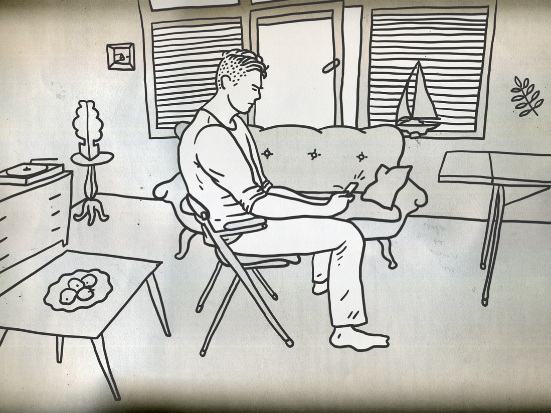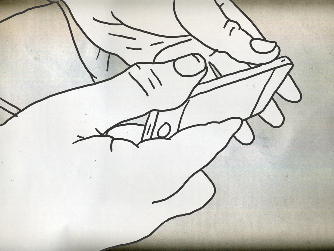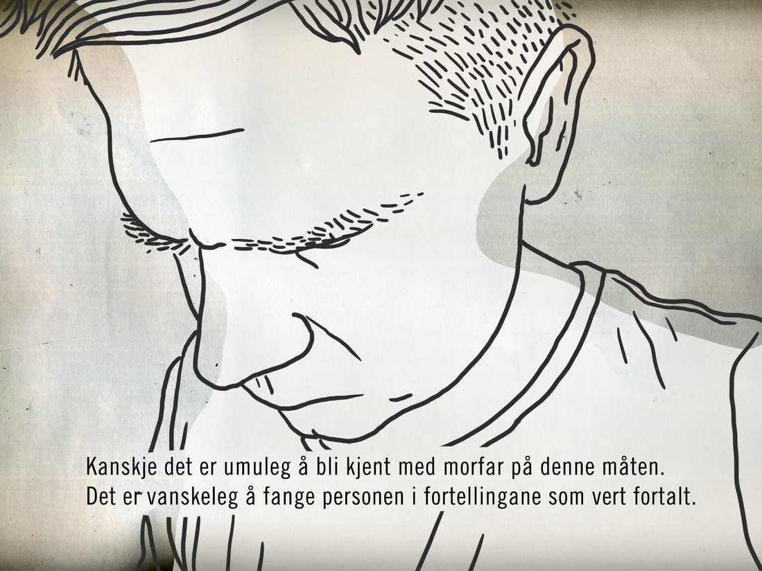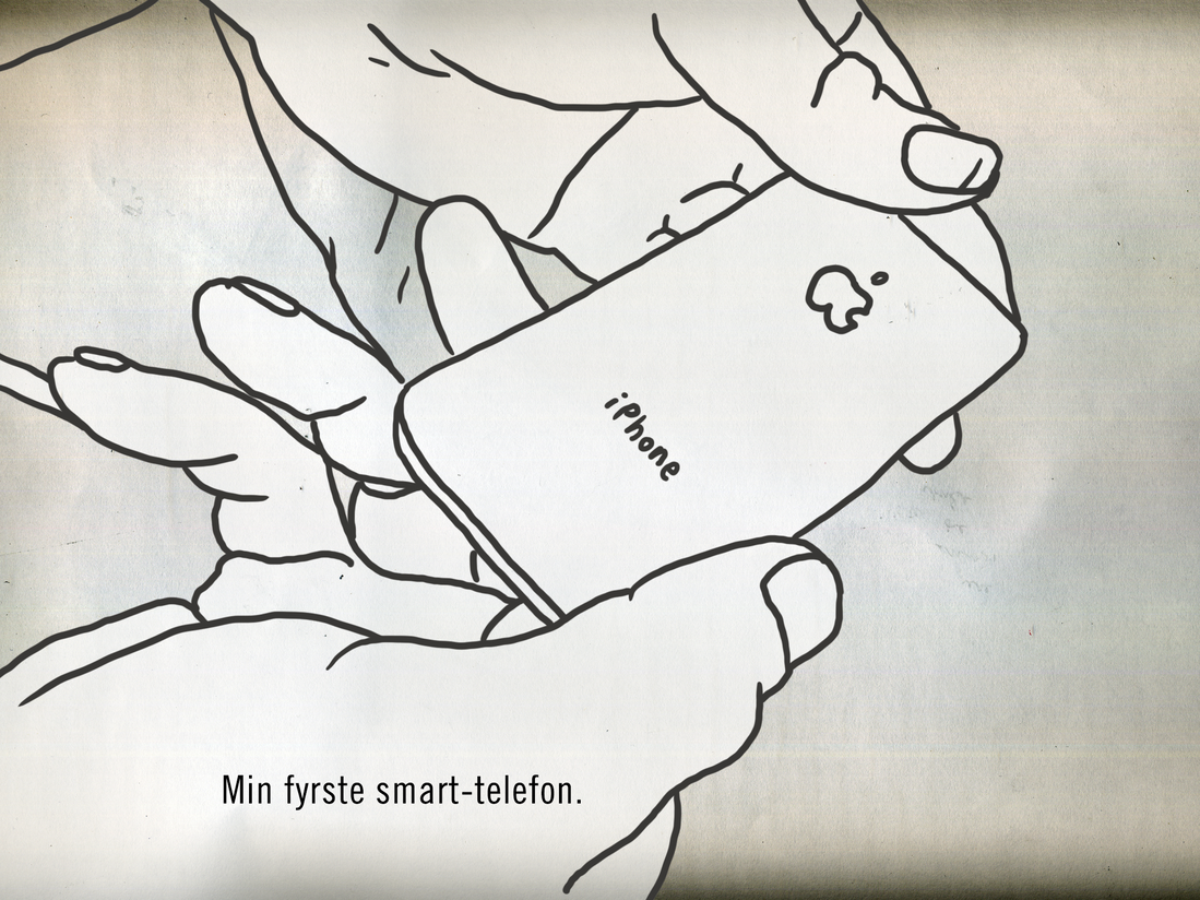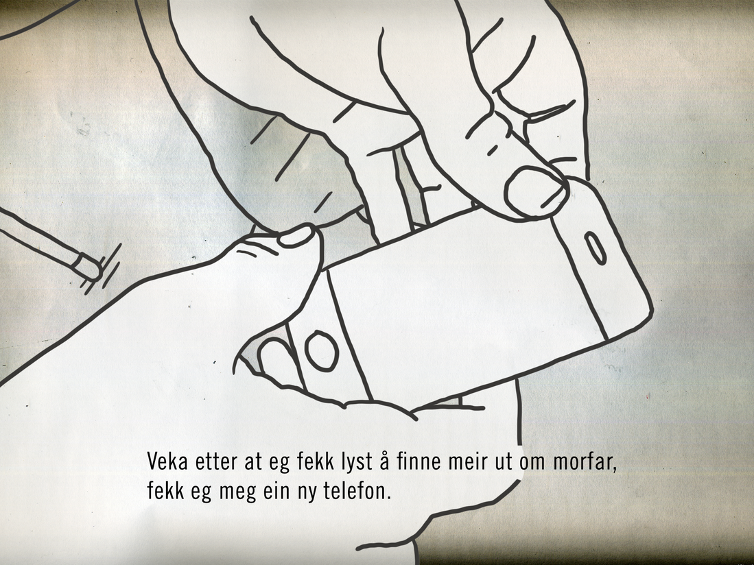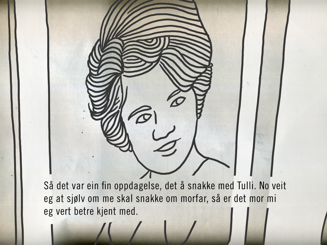 There are also interactive motions or changes connected to the gyroscope that makes the iPad register how the reader is holding the tablet. The first gesture-controlled motion is in the opening menu, where the portraits of me and my grandfather can slide towards each other. They never end up exactly side by side, which is a visual metaphor of one of the comic’s conclusions. I also used the gyro controls to affect the illustrations. For example, the glossy Scotch tape, which is a graphic element in the illustrations, reflects light differently depending on how the reader holds the tablet (Video 106). This creates subtle vibrant motion in the static images.