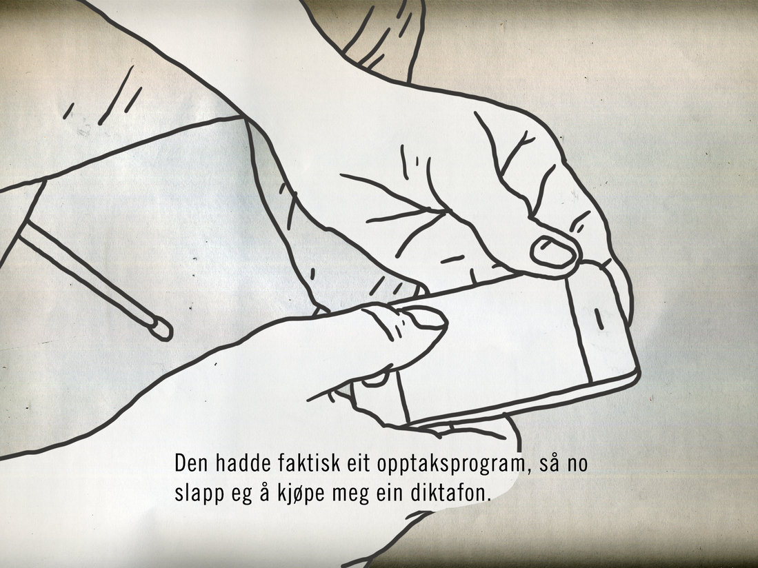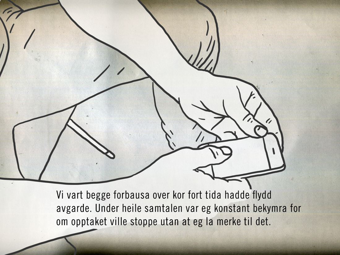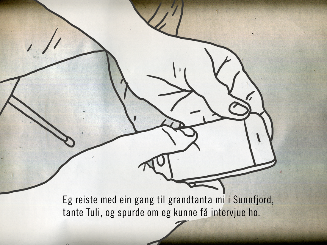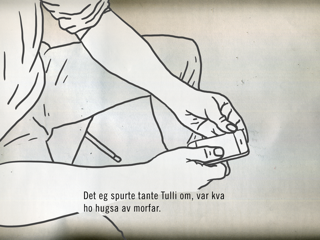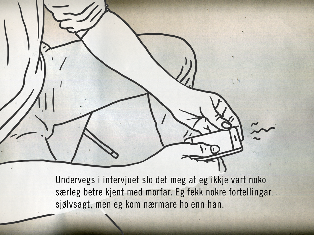 Music had a central role in Sound of the Aurora, and so also in this comic. In the story, music is one of the links between my grandfather and me. I engaged the musician Stephan Meidell to create the soundtrack for Close, Closer, Closest. He is a contemporary musician and his main instrument is the guitar. His musical interest is somewhere between the ambient and the melodic, and I thought he could make a soundtrack that did not require additional sound effects, since there are so many different noises in his soundscapes. I also wanted original music, with roots from my hometown, Bergen. We equipped Stephan with an iPad so he could keep up with the development of the comic, and we met frequently to implement his sounds into the comic. For these sessions, Eide, Meidell and I worked together in Meidell’s studio at Bergen Kjøtt, giving him the opportunity to create new tracks on site if needed.