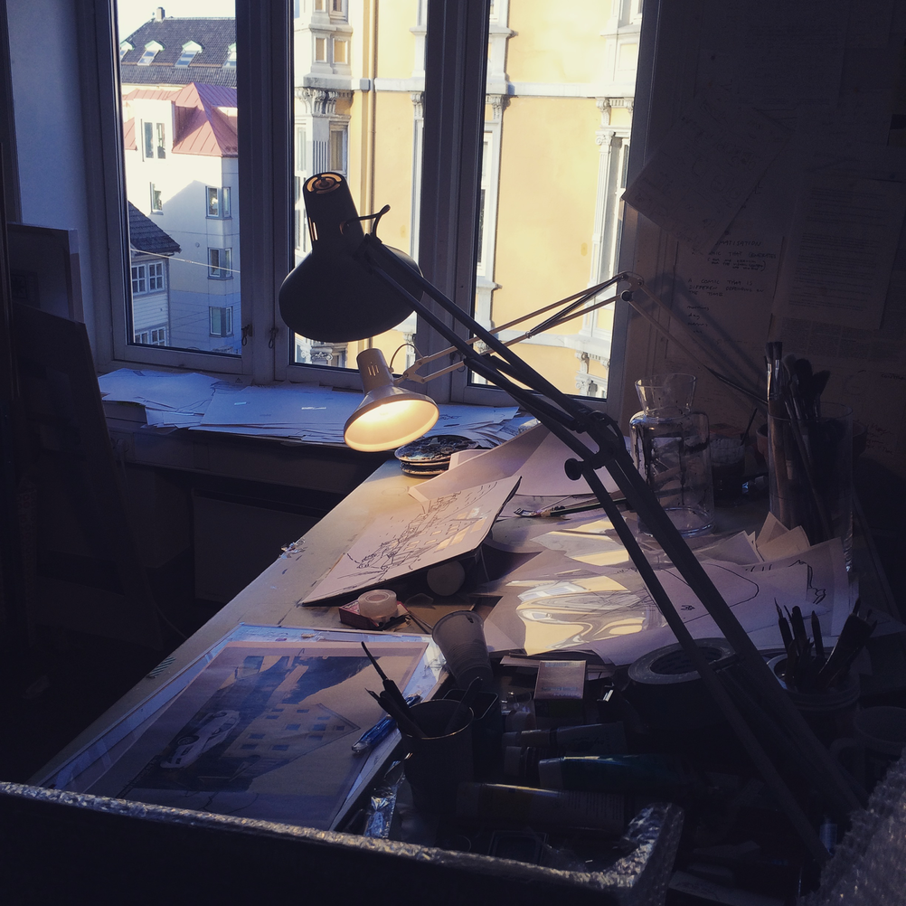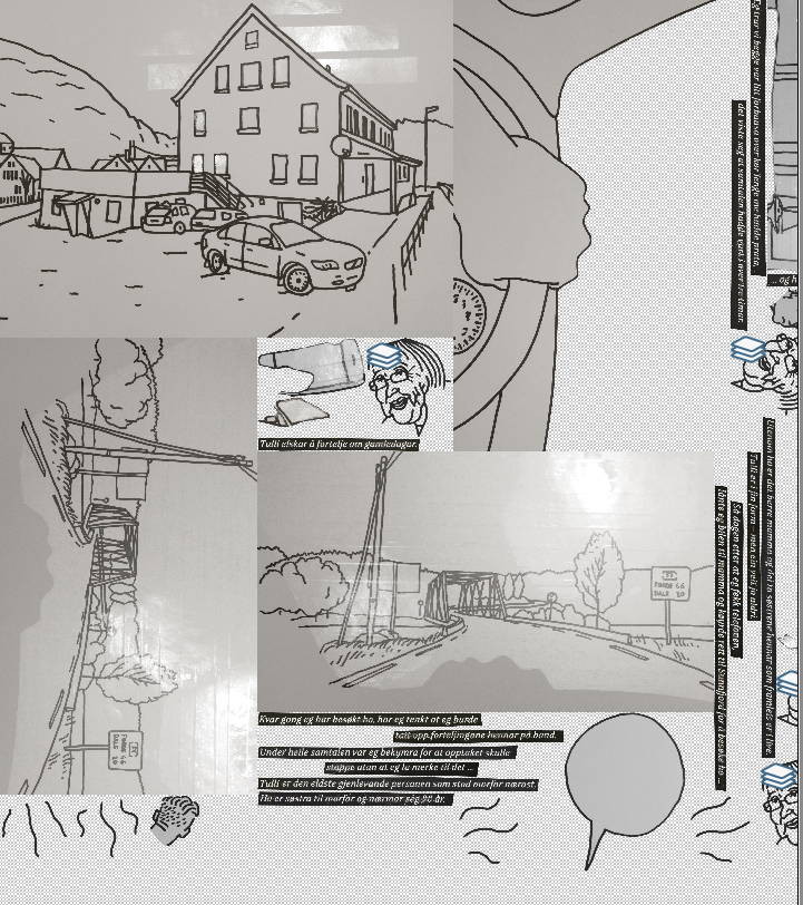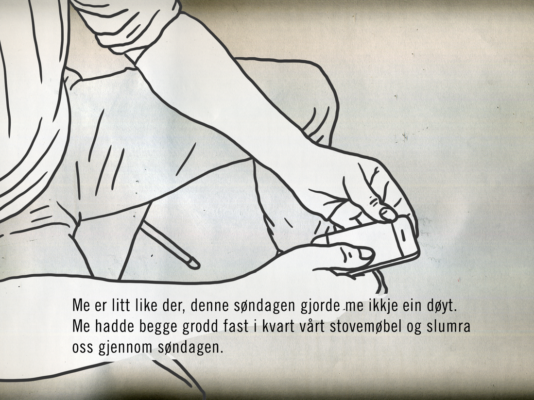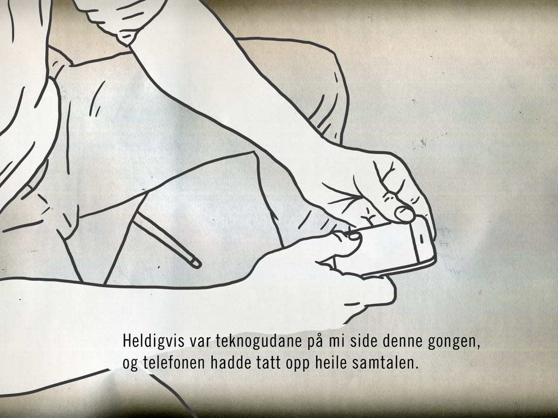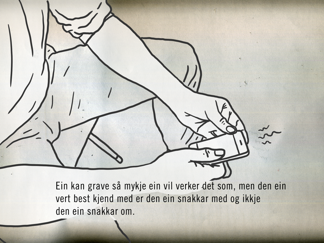 Music had a central role in Sound of the Aurora, and so also in this comic. In the story, music is one of the links between my grandfather and me. I engaged the musician Stephan Meidell to create the soundtrack for Close, Closer, Closest. He is a contemporary musician and his main instrument is the guitar. His musical interest is somewhere between the ambient and the melodic, and I thought he could make a soundtrack that did not require additional sound effects, since there are so many different noises in his soundscapes. I also wanted original music, with roots from my hometown, Bergen. We equipped Stephan with an iPad so he could keep up with the development of the comic, and we met frequently to implement his sounds into the comic. For these sessions, Eide, Meidell and I worked together in Meidell’s studio at Bergen Kjøtt, giving him the opportunity to create new tracks on site if needed.