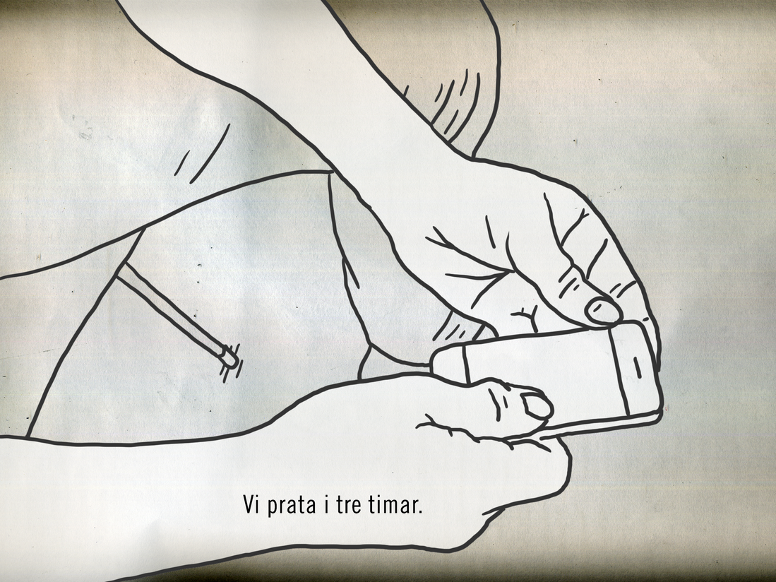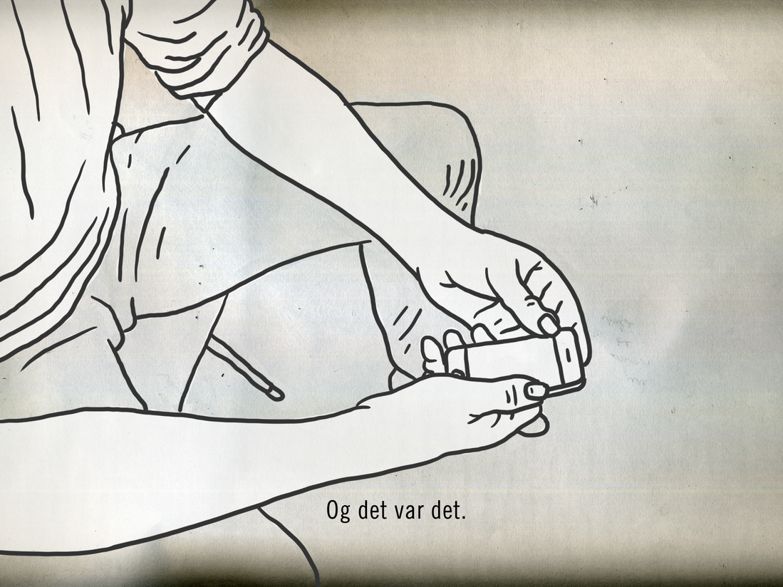 The fourth interactive full motion animation is the phone call scene (Video 104). This is also classic animation, made by rotoscoping motion from video footage (Video 105). I had originally planned to show the narrator’s text in the whole animation, but it did not work in practice. It was too easy to scroll past the text, thus a crucial flaw. Another problem was the iPad’s technical limitations. An image sequence is a heavy type of animation, even more so when it includes dialogue, so when making the comic, the image sequence soon became too long for the iPad to handle. As mentioned earlier, we used old iPads to make sure that if a reader had old hardware, it would not crash. This scene therefore did not turn out as I intended, and the compromise was to freeze and create a cinematic panel sequence in the middle, then end with the rest of the interactive animation. The shaking and wiggling qualities of the film are due to the hand-held source material. I wanted to add a ‘nerve’ to the imagery by using a mobile frame, in contrast to the continuously fixed frame that dominates the comic. Despite it being a challenging scene to make and despite not turning out perfectly, it still marks the turning point in the comic, and it differs from the rest with is full motion animation, which was my overall intention.