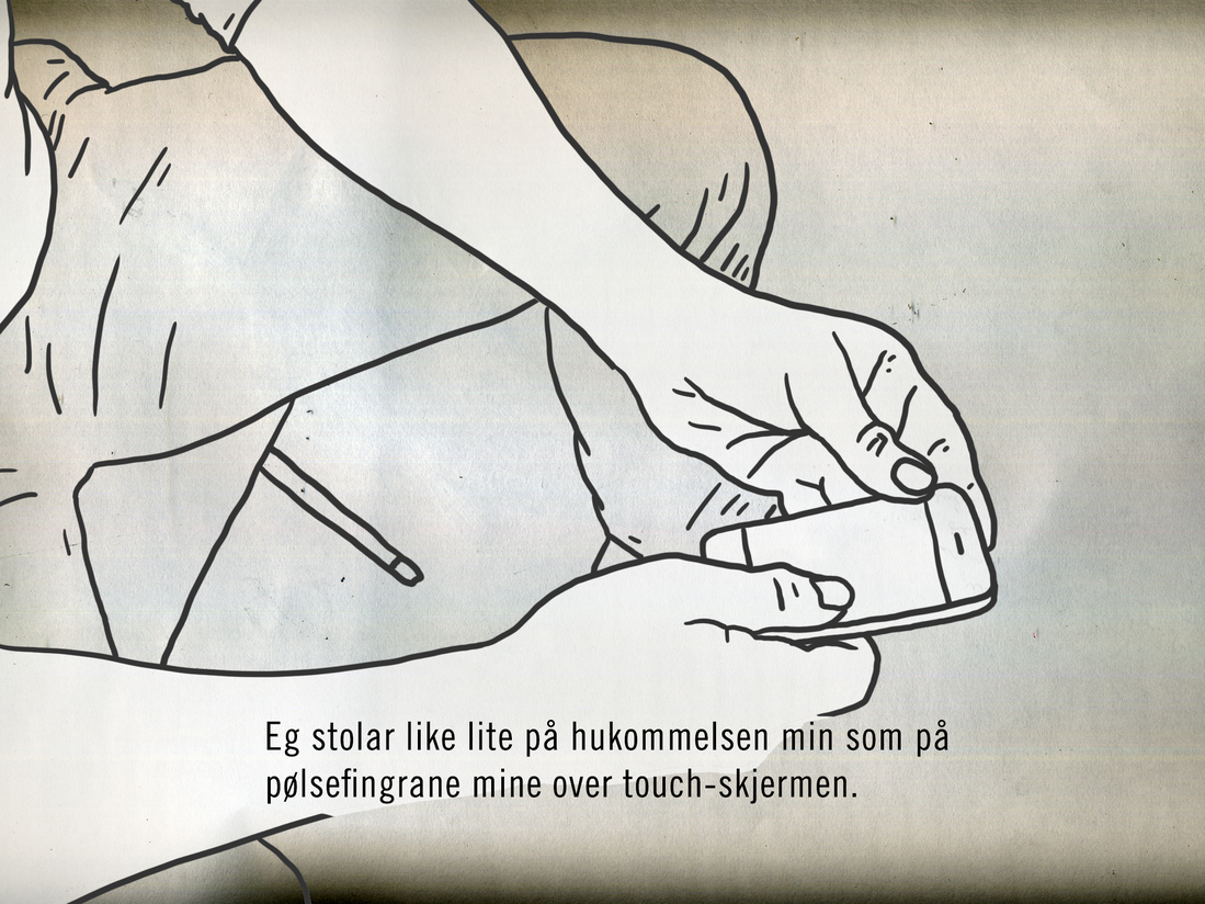 In a workshop with my secondary supervisor Septimiu Moraru and the Bergen-based comic artist Kim Holm, we established that it was important to facilitate a comfortable and relaxed reading position. I ended up adopting a suggestion from Holm: readers hold the tablet with both hands and only use their thumbs, almost like a game controller (Picture 23). Thumbs are very flexible and can do vertical, horizontal, diagonal and circular motions, so are not that limited at all. However, when I observed people using a reading tablet, they mostly held it with their right hand and used their index finger to tap the screen. Since my user interface differed from this, it became unconventional. I therefore needed to inform readers about the control system with a small tutorial. That the user interface needs to be accompanied by a tutorial does not need to be perceived as negative. Tutorials are common in computer games because user interfaces can vary from publication to publication. Digital comics and computer games share the same premises as new media. The fact of needing a tutorial is more a confirmation of the principle of variability in new media (Manovich 2001: 36). Since user interfaces can vary, not informing readers about the controls can result in negative user experiences. I placed the tutorial for Close, Closer, Closest at the beginning of the app. There is always a possibility that readers will skip over it, but it is there and always available in the main menu.
