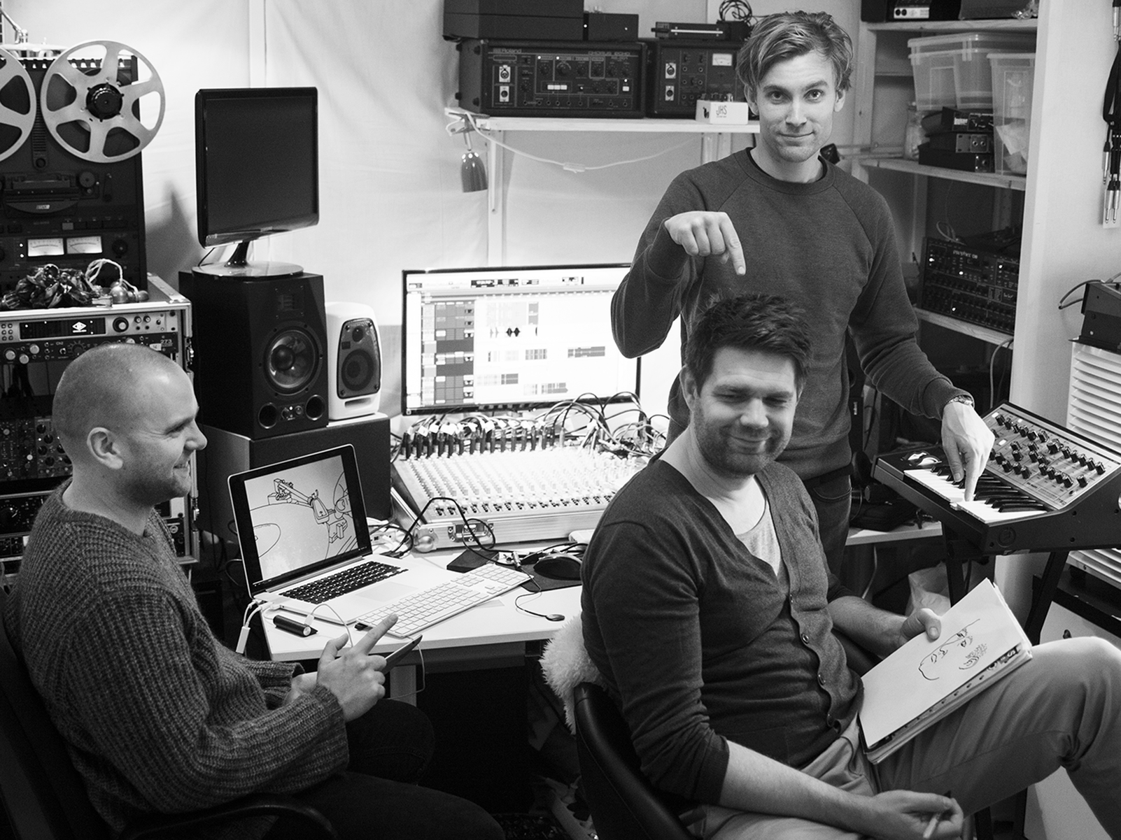 Picture 27: The trio behind Close, closer, Closest. From the left Hans Philip Eide (programming), me Fredrik Rysjedal and Stephan Meidell (music composer). Here we work in Meidell's studio.