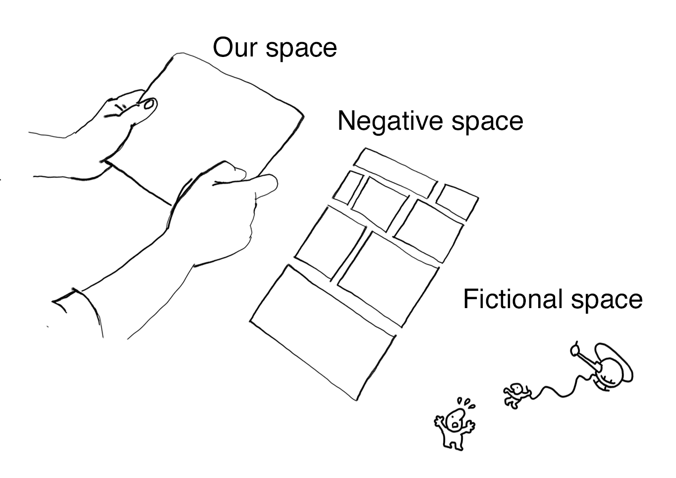 Ann Friedman’s presentations of sub-screens inspired me to create a sub-screen perspective on digital comics which helped me define its levels of screens and virtual space (Figure 8). This perspective or model has become an important tool for me when I write and talk about digital comics. When conceiving of the structure of a comic in terms of levels, I realized there was a need for a neutral term to describe the level or space in which panels are arranged, because ‘the page’ is only one of several presentation forms in a digital comic. I therefore named the space or level in which panels are arranged ‘negative space’, based on the graphic-design term ‘white space’ in page layouts. A traditional set of levels would therefore be as follows: ’our space’, the ‘negative space’ and the ‘fictional space’. By defining these three levels, it becomes possible to map the techniques that are used to create digital comics.