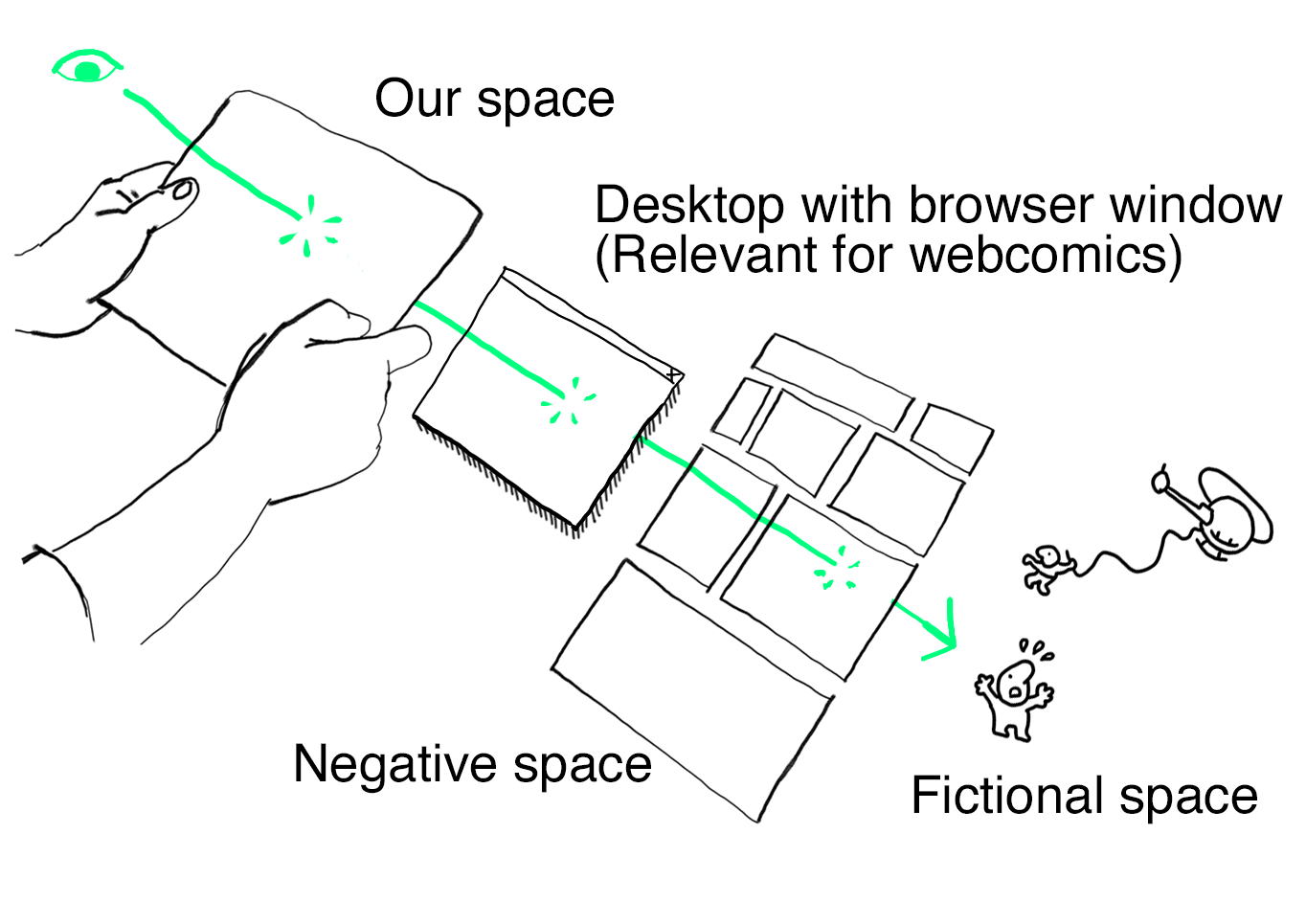 Should I use the established diegesis rather than the sub-screen map when conceptualizing digital comics? I think both are useful. The concept of diegesis offers a neutral-level system that relates to fictional storytelling. The sub-screen map, on the other hand, is more specific to digital comics and makes it easier to identify, locate and plan the vast operations, properties and formats in a digital comic. The sub-screen map shows the role and position of the infinite canvas in the structure of the digital comic. It defines a space between the fictional reality and our reality, which is the negative space. With these levels defined and the notions of filters and the diegesis, we end up with a terminology fitted to describe my comics on a theoretical level.