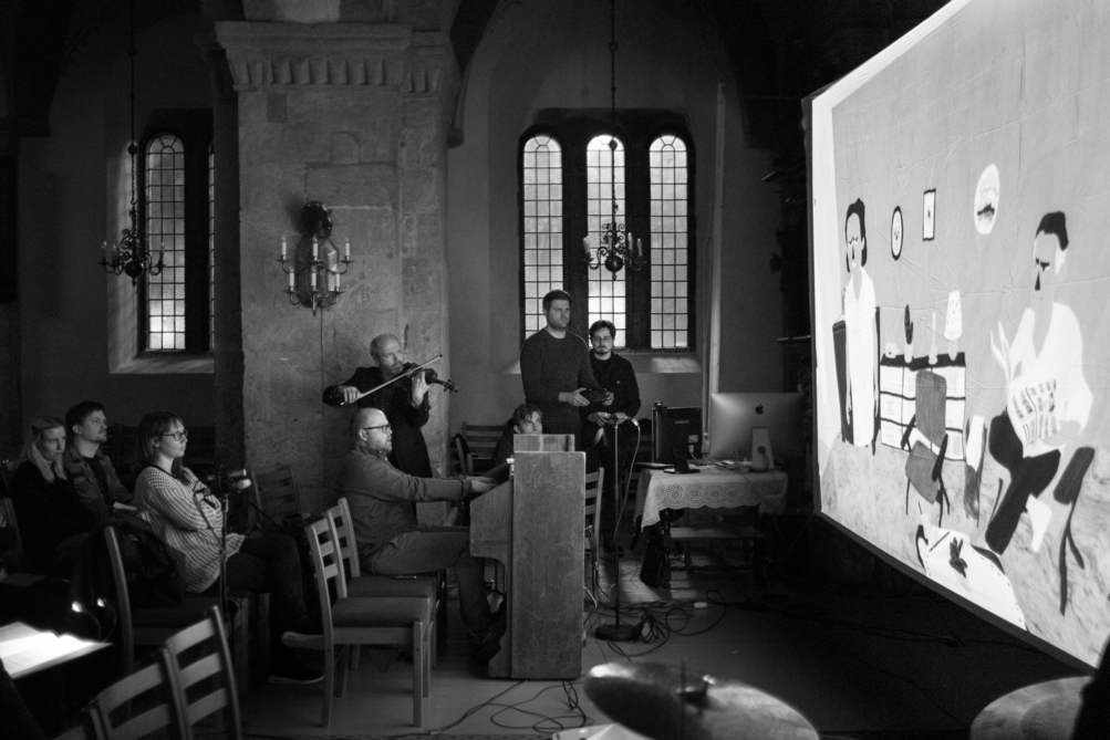 Video 120: Collaboration. This is a video from the 1982 festival at Bergen Kjøtt in 2015. This was the first time i used the video jockey software Module 8. Together with the music trio 1982 and Ingebjørg Loe Bjørnstad (recorded) I performed the digital comic Sound of the Aurora. From the left: Fredrik Rysjedal, Øyvind Skarbø and Nils Økland.