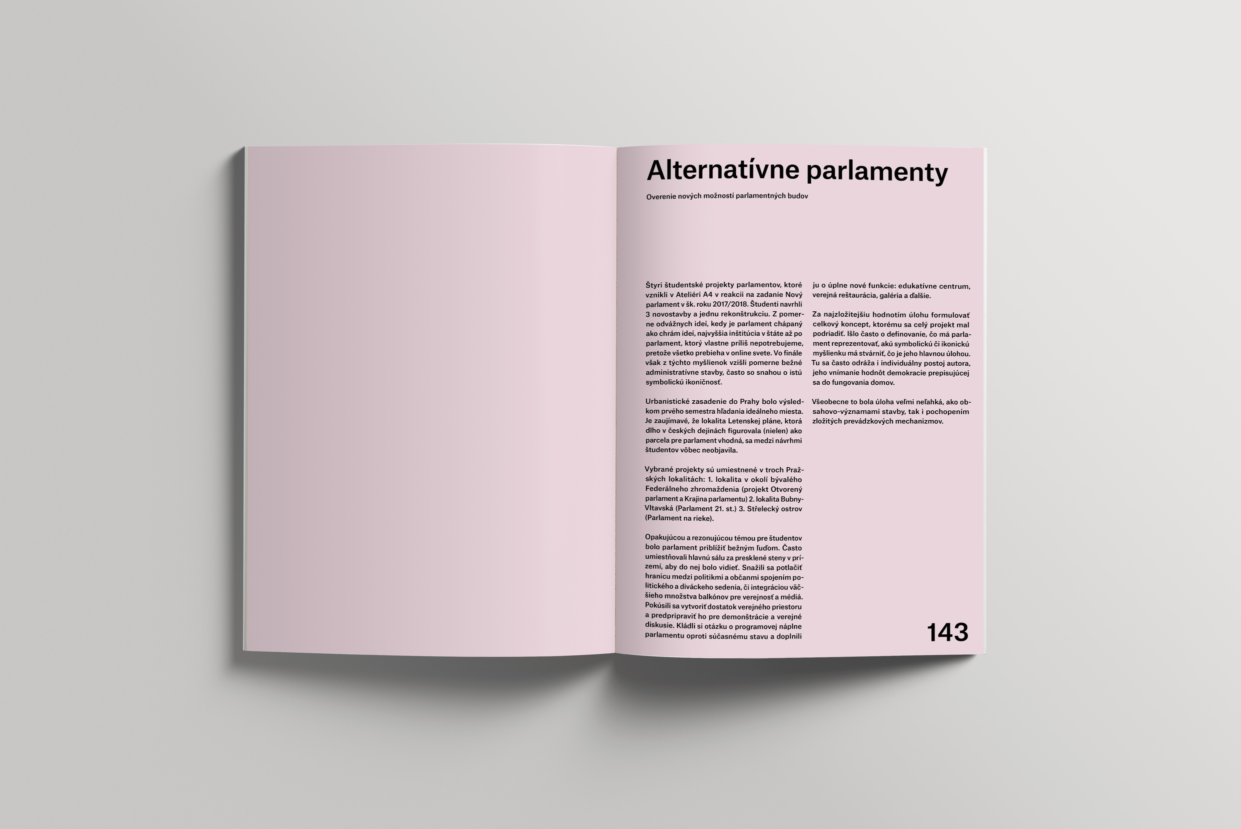 Štyri študentské projekty parlamentov v kapitole Alternatívne parlamenty- Overenie nových možností parlamentných budov, vznikli v Ateliéri A4 v reakcii na zadanie Nový parlament v školskom roku 2017/2018 počas mojej pedagogickej praxe. Študenti navrhli 3 novostavby a jednu rekonštrukciu. Z pomerne odvážnych ideí, kedy je parlament chápaný ako chrám ideí - najvyššia inštitúcia v štáte až po parlament, ktorý vlastne príliš nepotrebujeme, pretože všetko prebieha v online svete. Výsledkom sú na prvý pohľad bežné administratívne stavby, často však so snahou o istú symbolickú ikoničnosť.