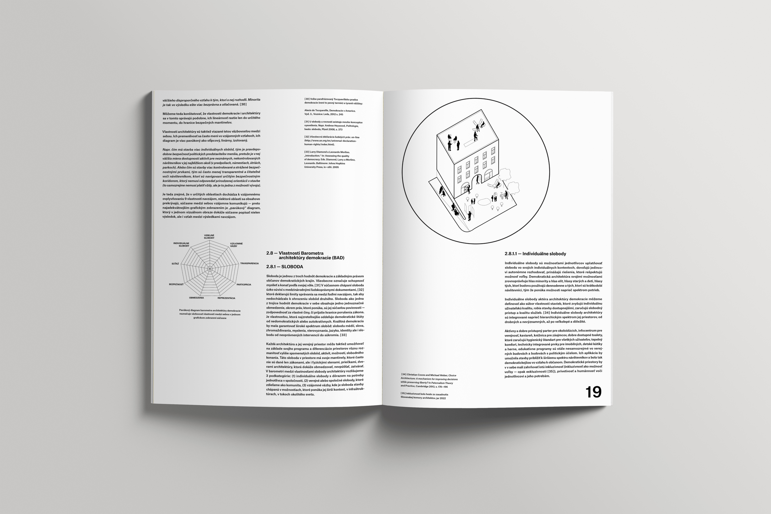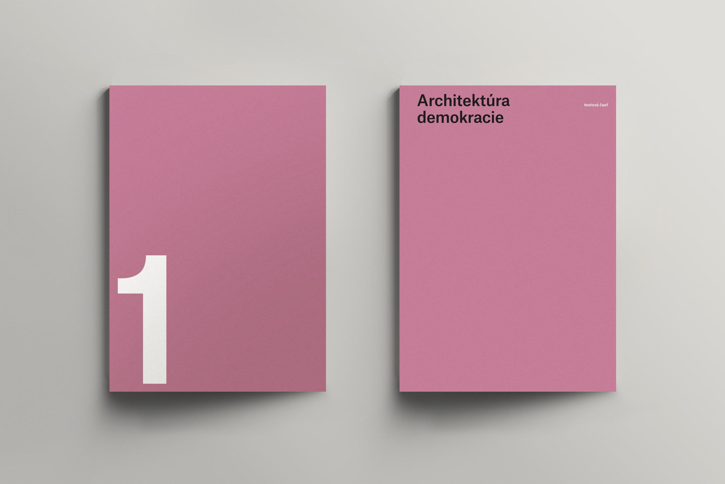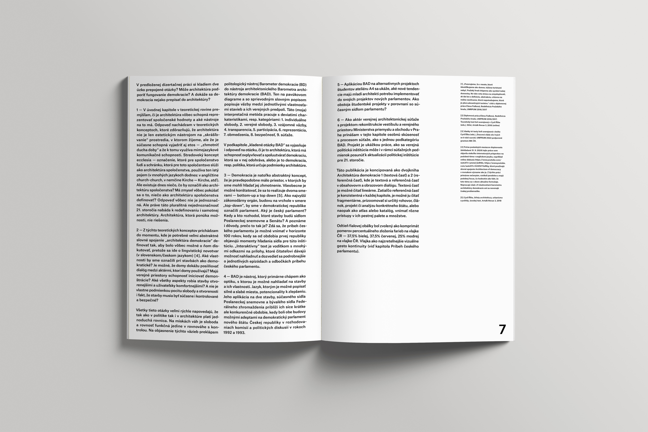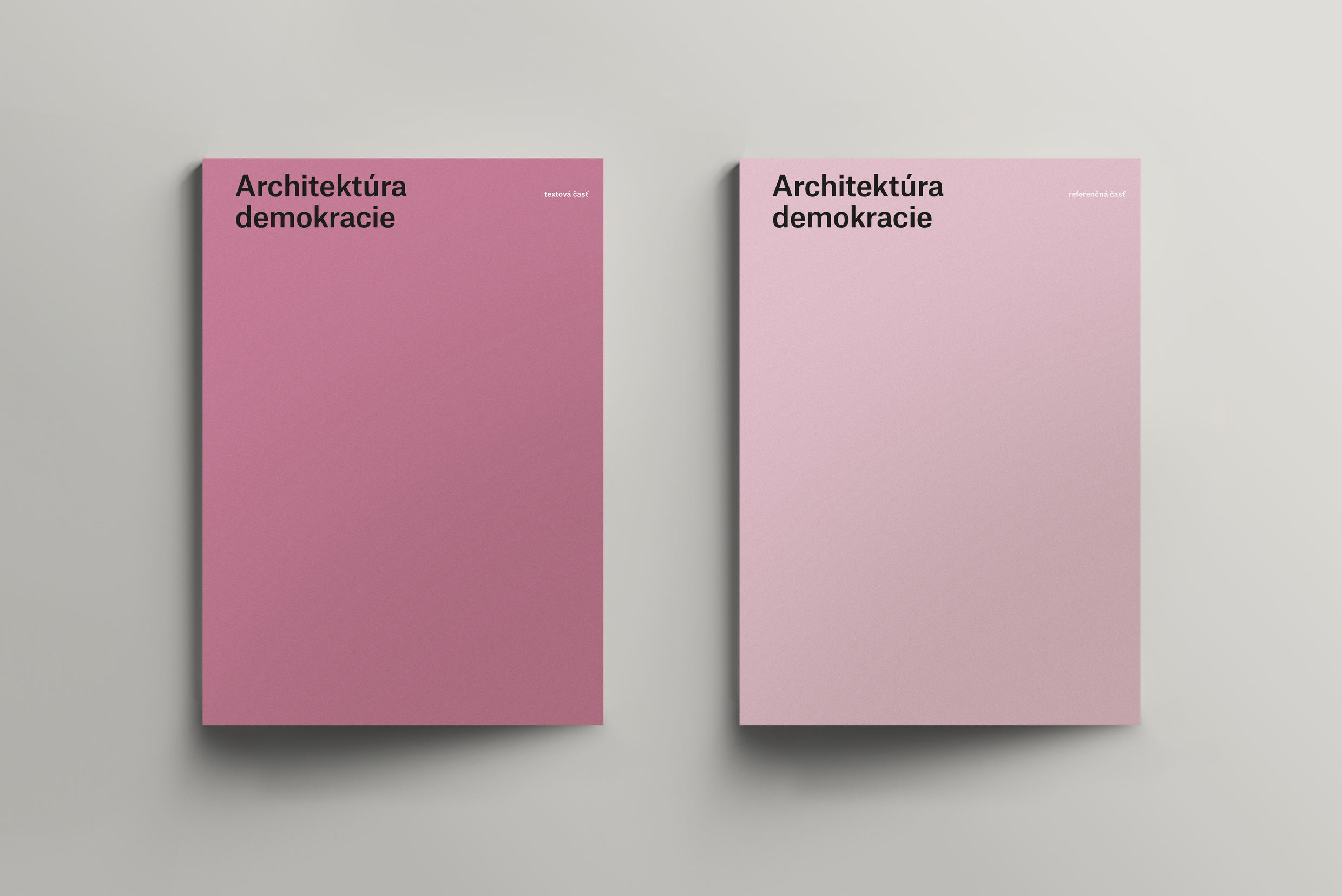 Ukážka dvojknihy Architektúra demokracie 1 (textová časť) a 2 (referenčná časť), kde sú obe časti v obsahovovm a obrazovom dialógu. Vznikla ako dizertačná práca Eleny Fialkovej na UMPRUM v ateliéri A4.