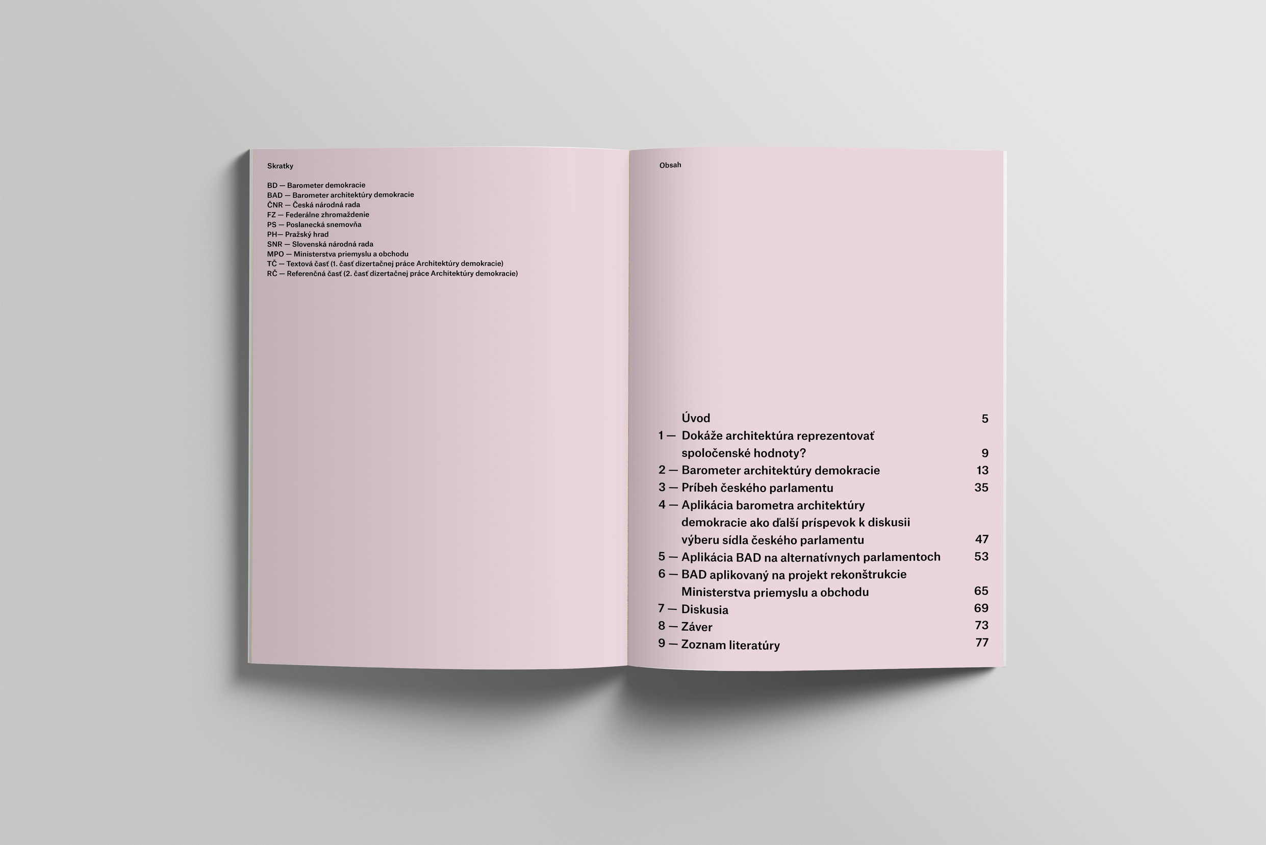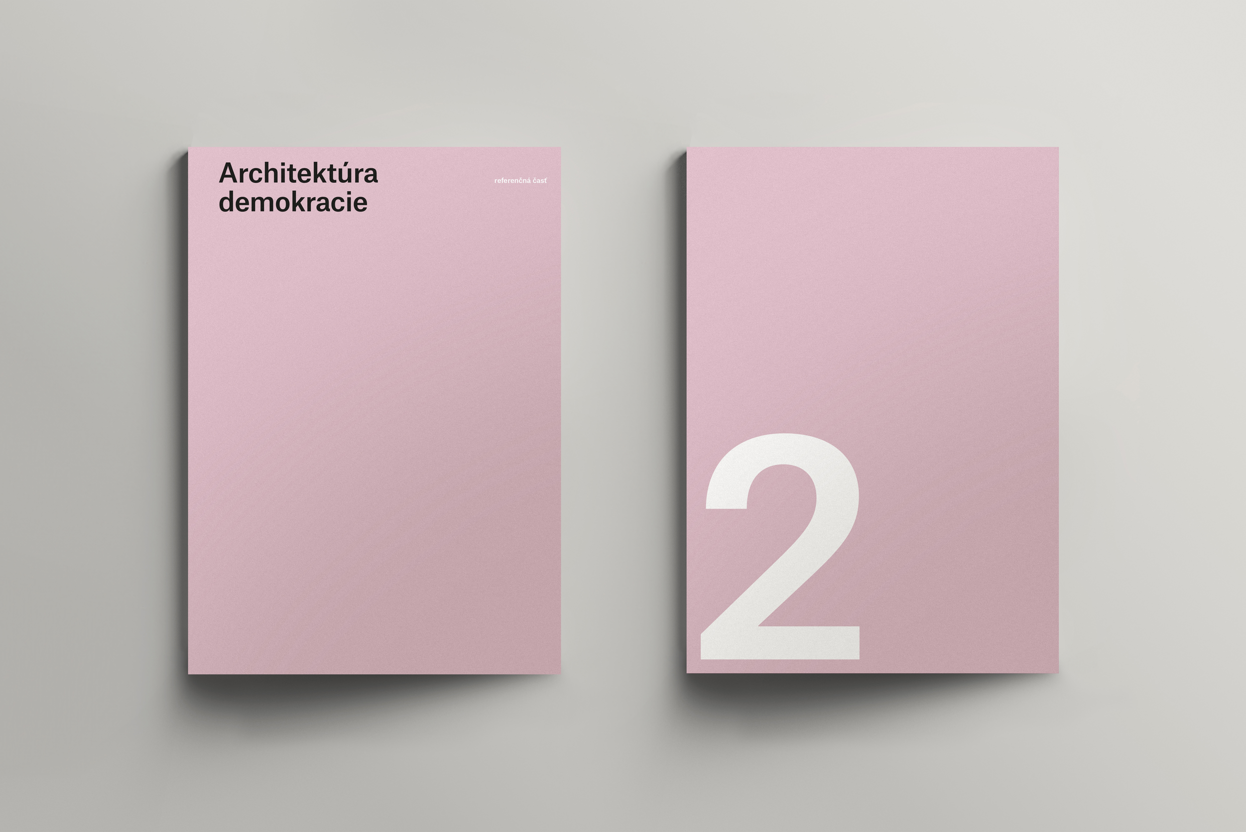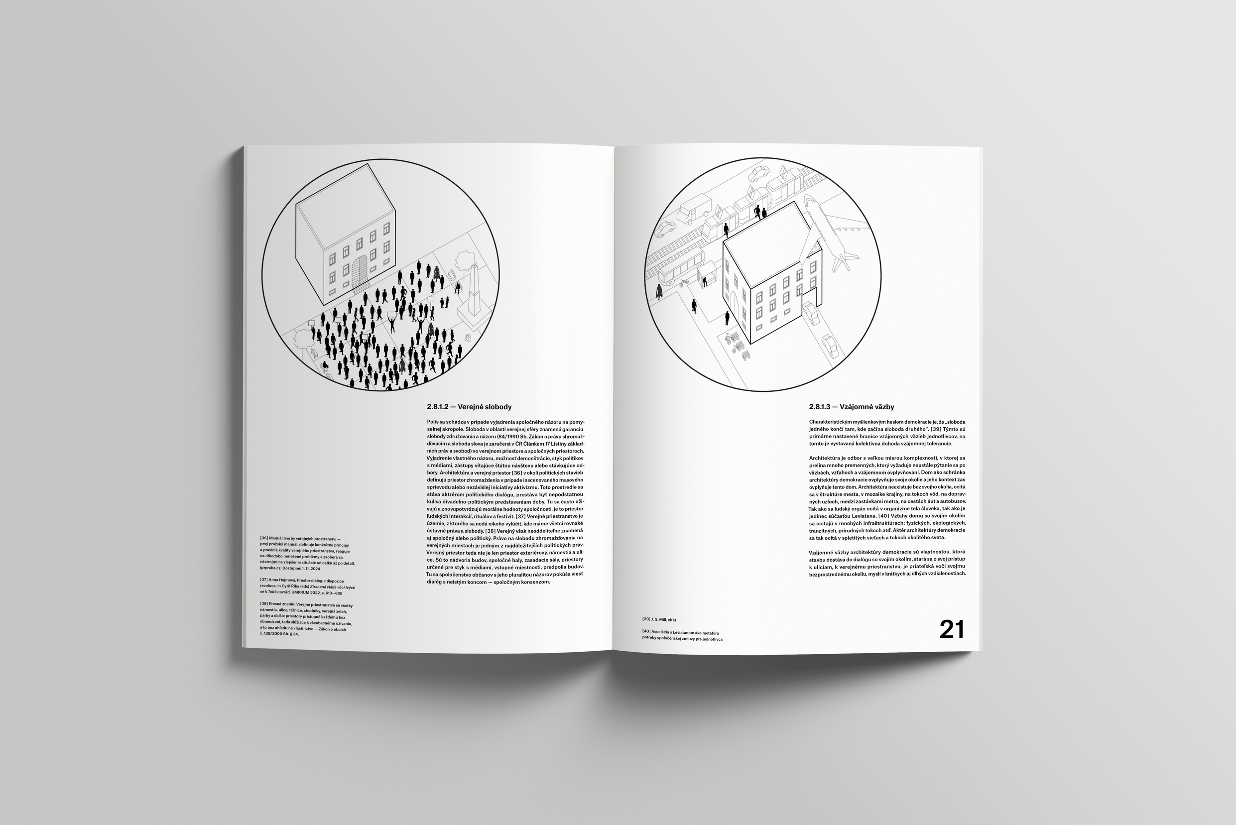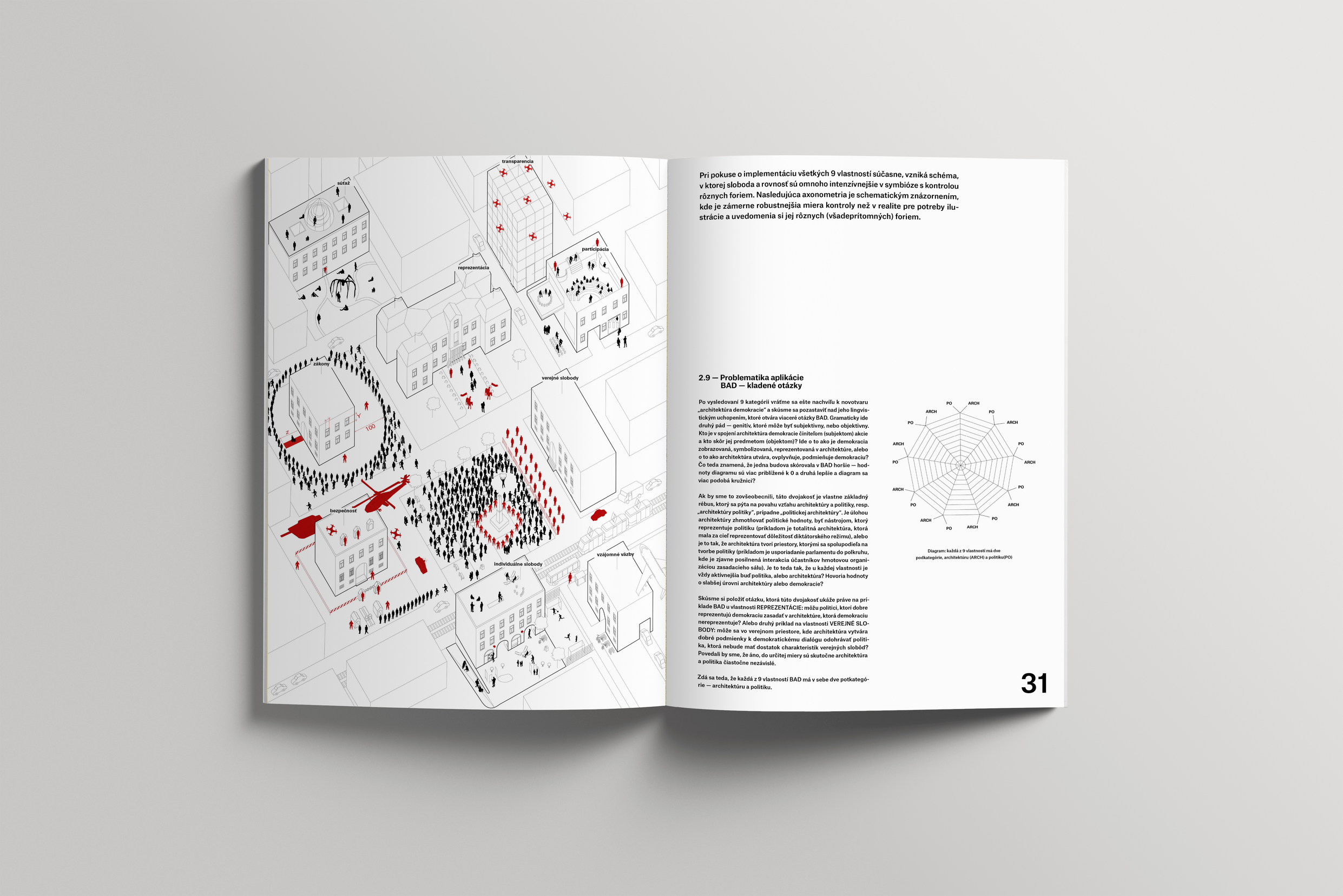 Ukážka dvojknihy Architektúra demokracie 1 (textová časť) a 2 (referenčná časť), kde sú obe časti v obsahovovm a obrazovom dialógu. Vznikla ako dizertačná práca Eleny Fialkovej na UMPRUM v ateliéri A4.