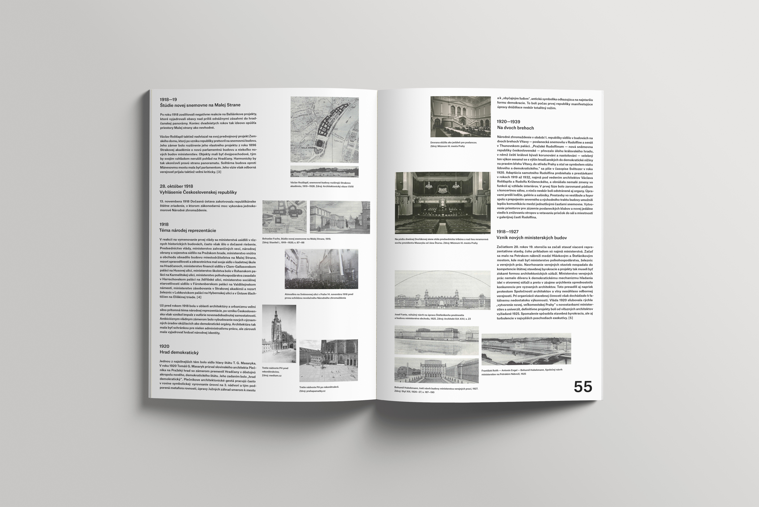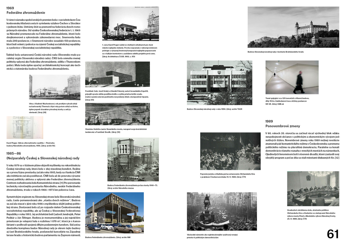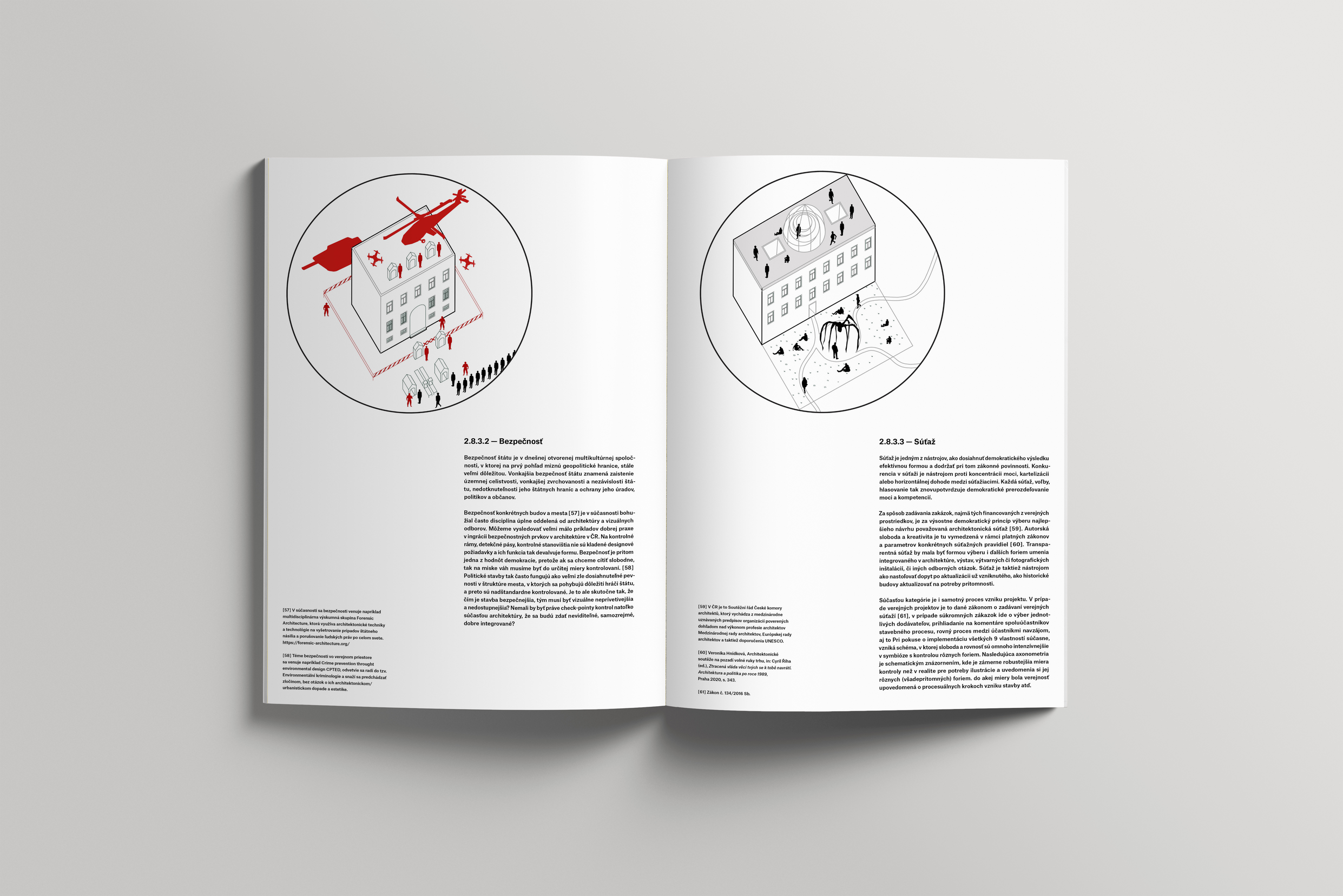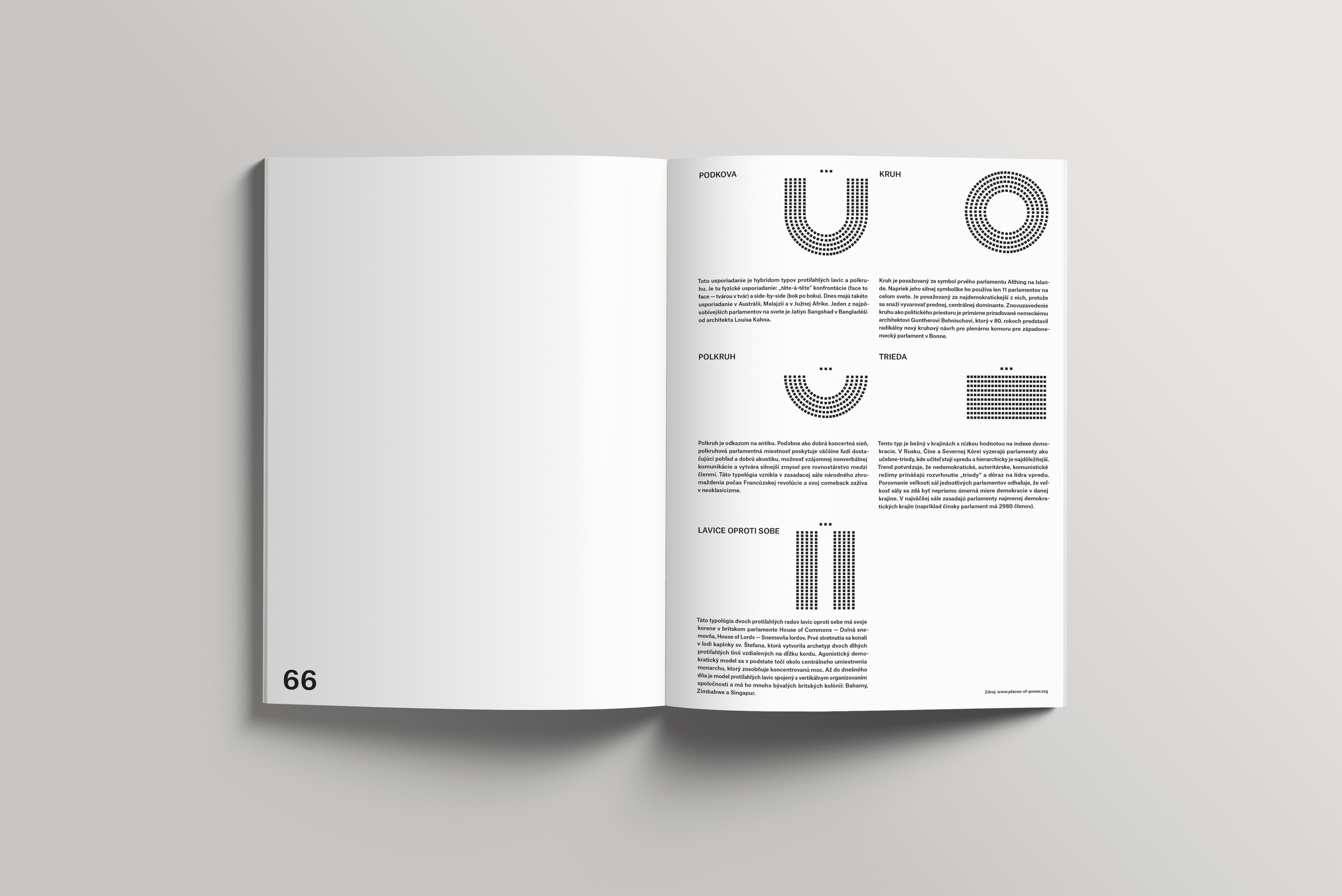 Ukážka dvojknihy Architektúra demokracie 1 (textová časť) a 2 (referenčná časť), kde sú obe časti v obsahovovm a obrazovom dialógu. Vznikla ako dizertačná práca Eleny Fialkovej na UMPRUM v ateliéri A4.
