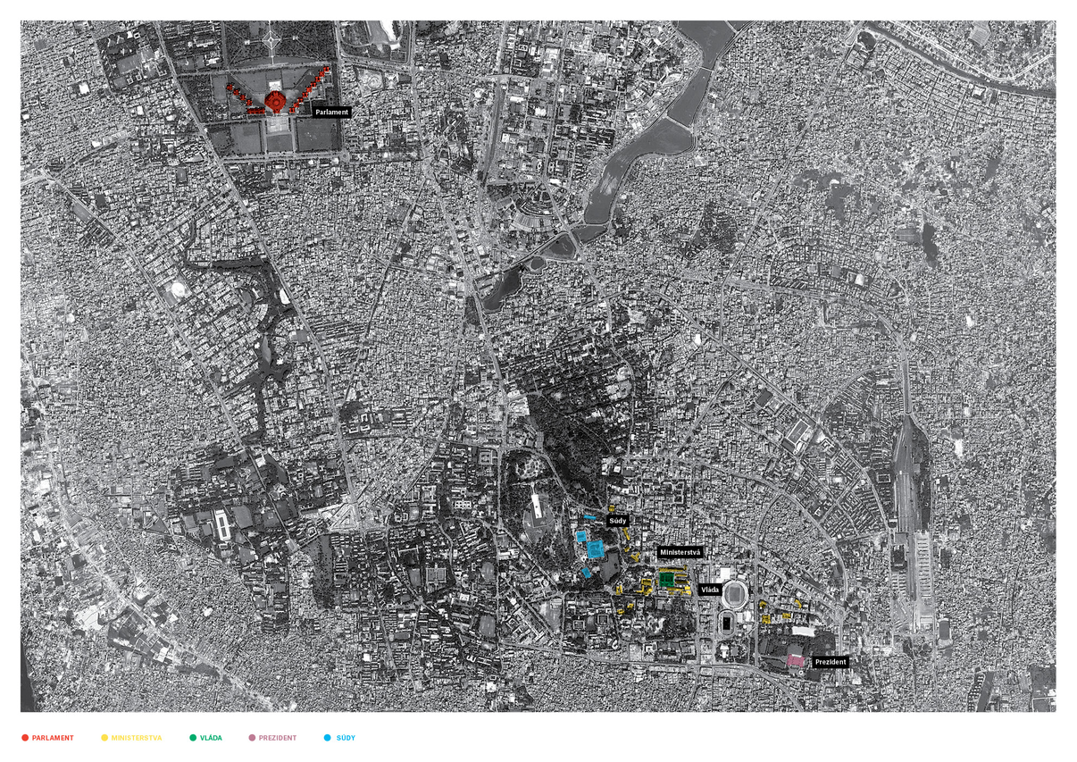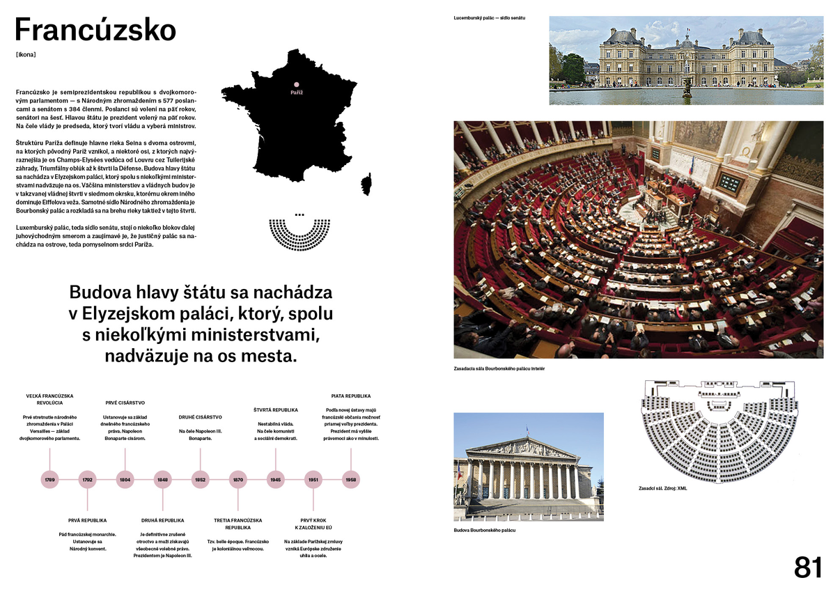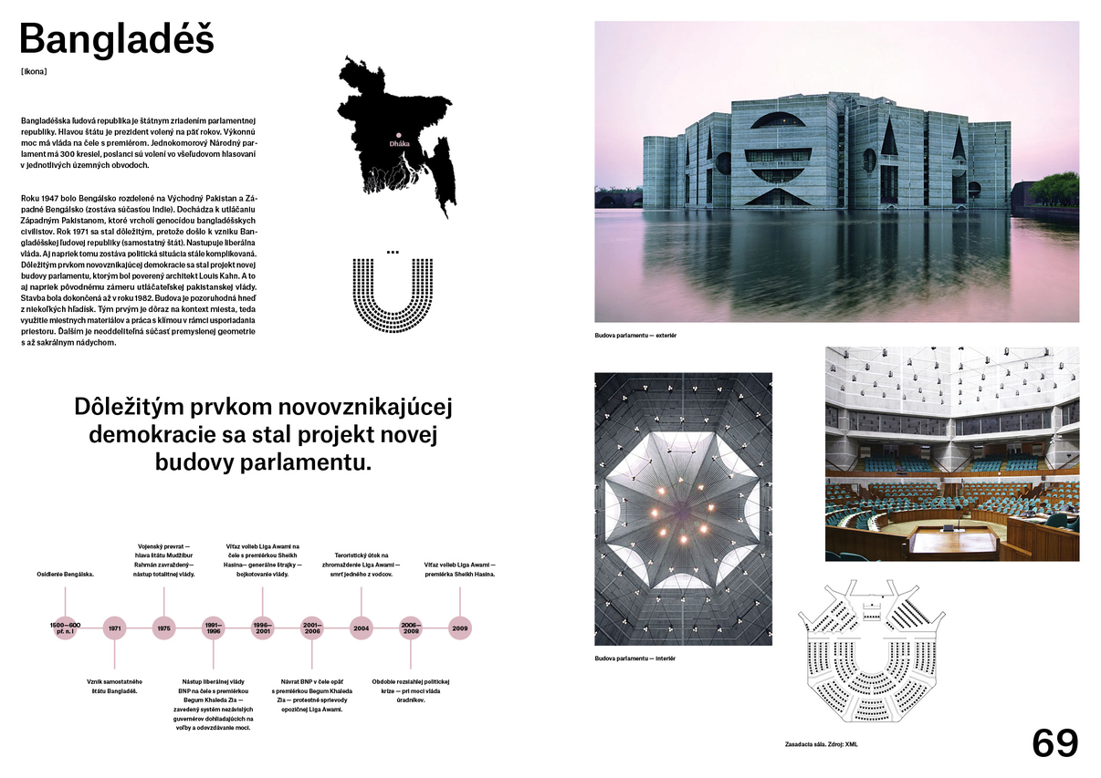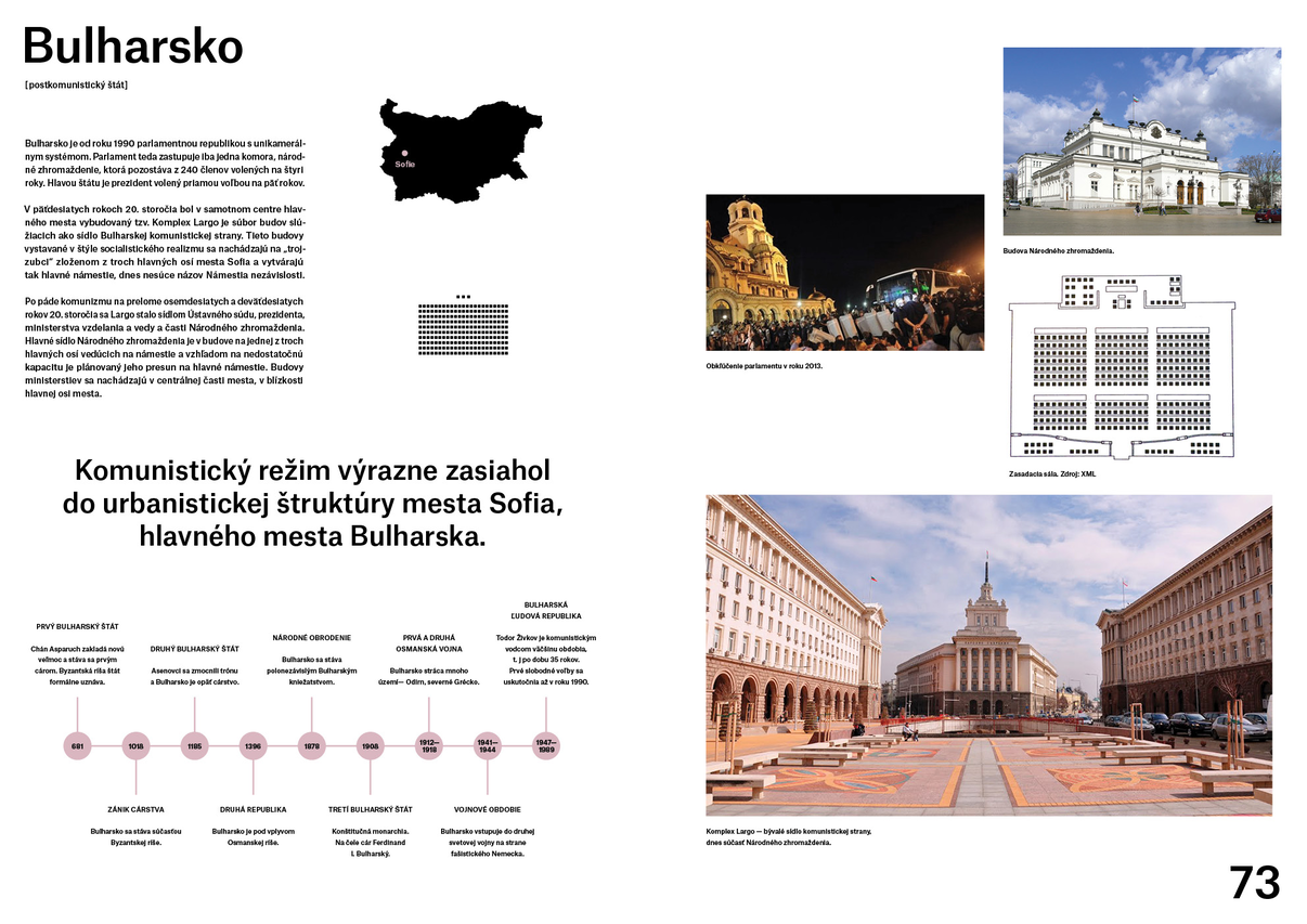 Akcent je opäť daný na budovu parlamentu ako reprezentatna demokracie v štruktúre mesta. Každý štát na časovej osi ponúka príbeh zmien politického zriadenia. Vybraných je niekoľko ilustračných fotografií. Mapy sledujú rozloženie politickej moci v štruktúre hlavného mesta (eventuélne jeho absenciu), možnú koncentráciu moci, mieru izolovanosti či naopak synergiu s ostatnými politickými budovami.
