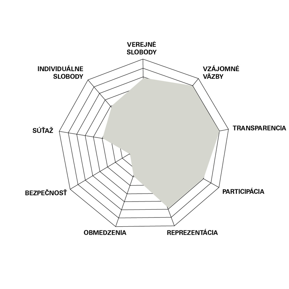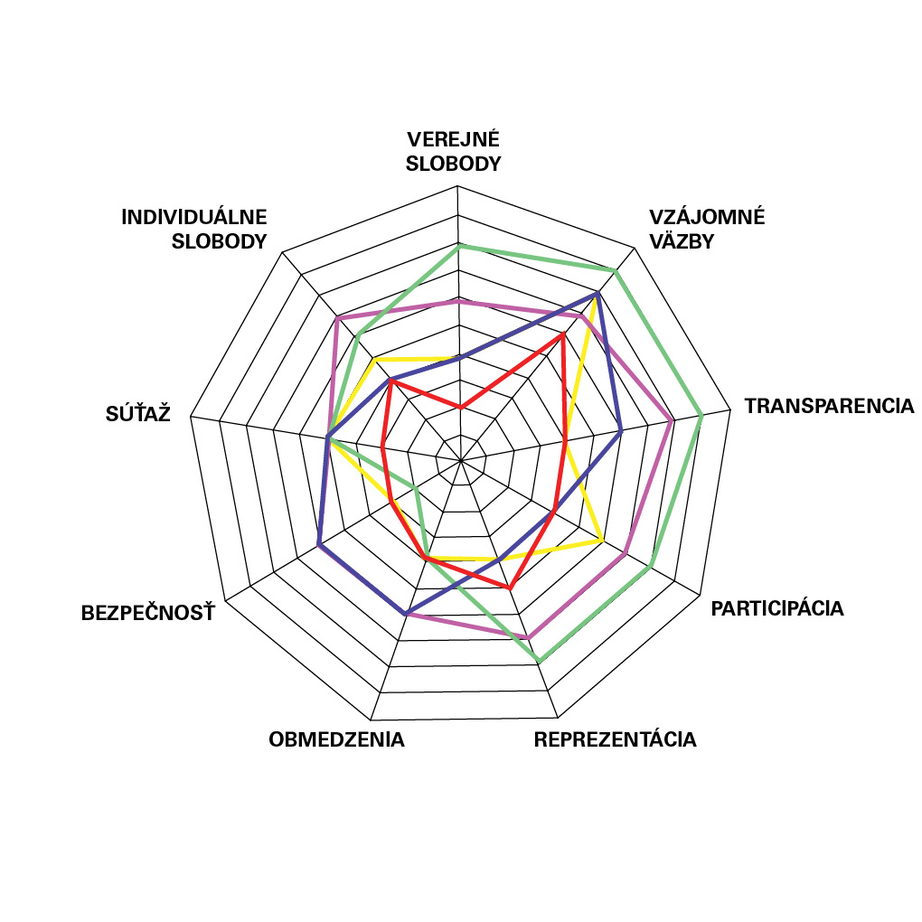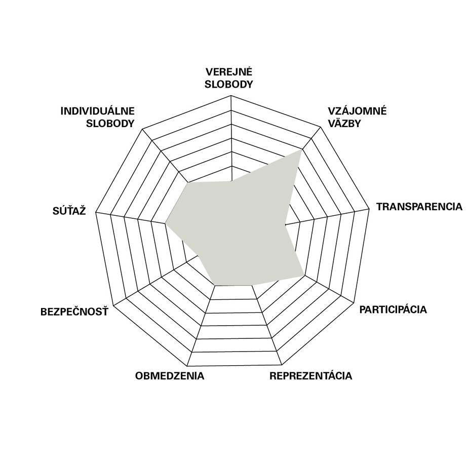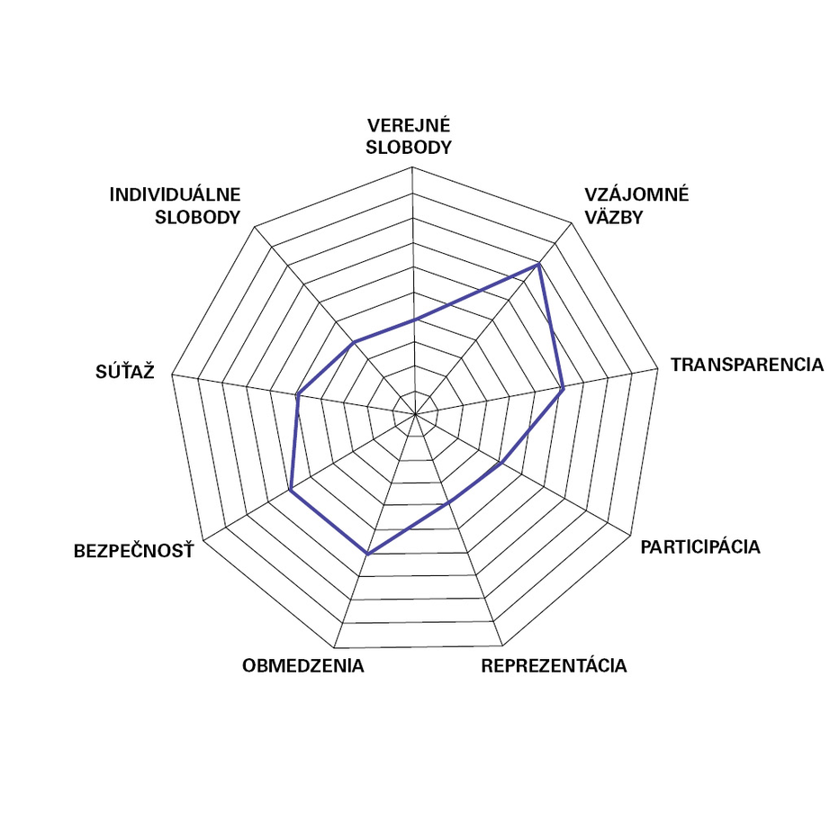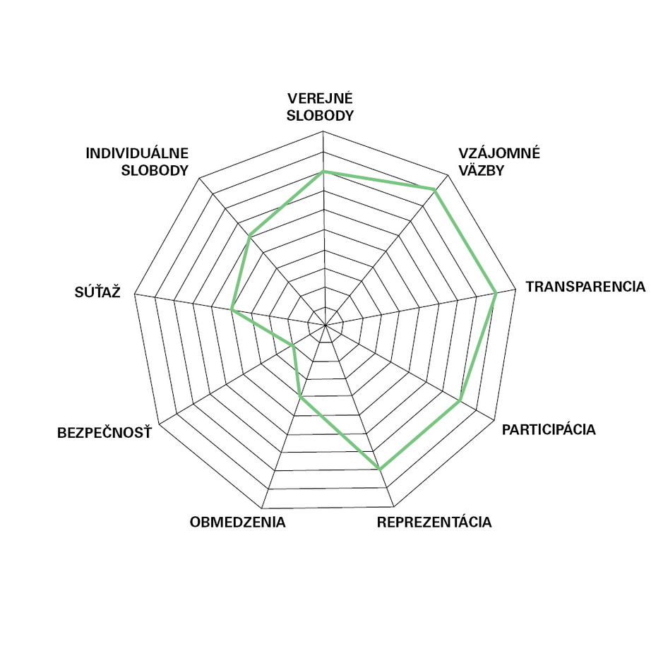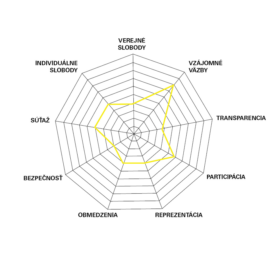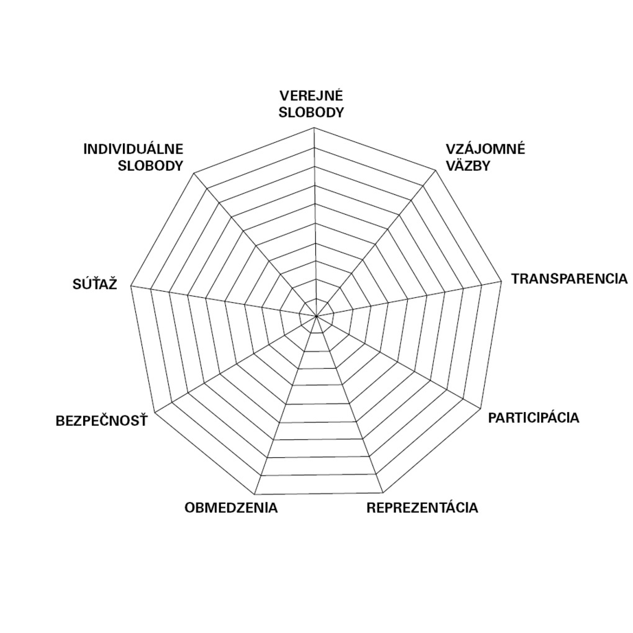 V demokratických systémoch je na miskách váh sloboda a rovnosť funkčná jedine v rovnováhe s kontrolou. Na objasnenie týchto väzieb preklápam politologický nástroj Barometer demokracie (BD) do nástroja architektonického Barometra architektúry demokracie (BAD). Interpretačná metóda pracuje s deviatimi charkateristikami, resp. kategóriami: 1. individuálne slobody, 2. verejné slobody, 3. vzájomné väzby, 4. transparencia, 5. participácia, 6. reprezentácia, 7. obmedzenia , 8. bezpečnosť, 9. súťaže. Vzťahovosť medzi vlastnosťami zobrazuje pavúkový diagram.