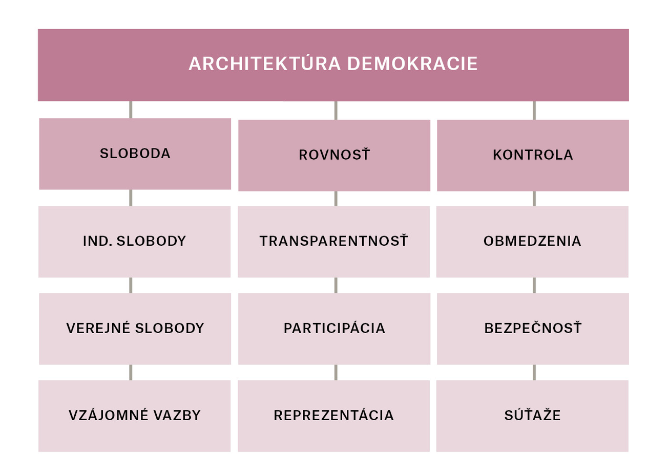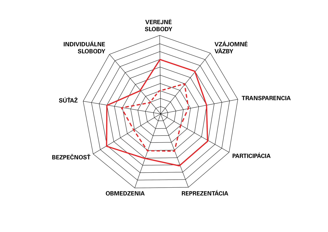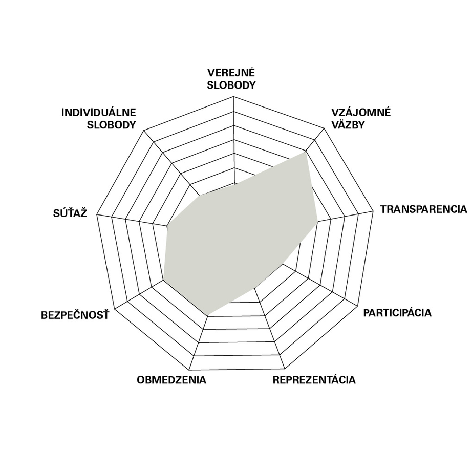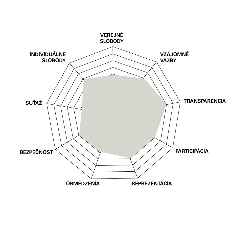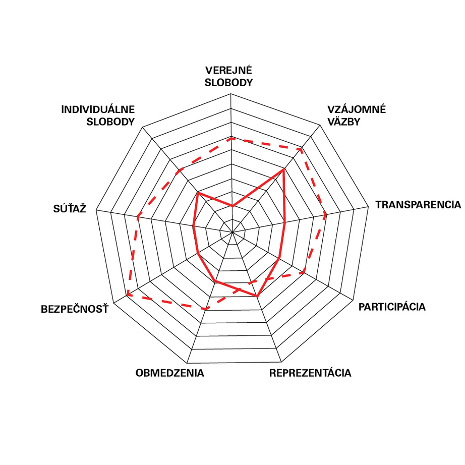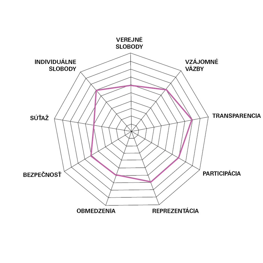 V demokratických systémoch je na miskách váh sloboda a rovnosť funkčná jedine v rovnováhe s kontrolou. Na objasnenie týchto väzieb preklápam politologický nástroj Barometer demokracie (BD) do nástroja architektonického Barometra architektúry demokracie (BAD). Interpretačná metóda pracuje s deviatimi charkateristikami, resp. kategóriami: 1. individuálne slobody, 2. verejné slobody, 3. vzájomné väzby, 4. transparencia, 5. participácia, 6. reprezentácia, 7. obmedzenia , 8. bezpečnosť, 9. súťaže. Vzťahovosť medzi vlastnosťami zobrazuje pavúkový diagram.