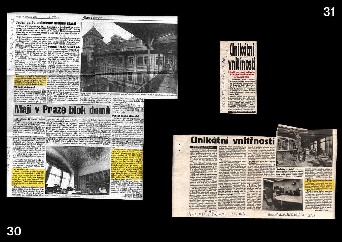 Články v kapitole Denná tlač - "Federální shromáždení pryč" fungujú ako mediátor medzi politkmi a verejnosťou. Vybrané reprodukcie dobovej tlače ilustrujú konkrétne procesy rozhodovania o sídle Parlamentu ČR pri vznikaní samostatného štátu. Ich prostredníctvom sa snažím dopátrať dôvodov, ktoré viedli k všeobecným negatívnym konotáciam budovy bývalého Federálneho zhromaždenia. Často skreslené interpretácie chrániace vlastné záujmy či uprednostňovaný uhol pohľadu tvoria mozaiku dobového diania v médiách počas rozhodovania o sídlach zákonodárnej moci.