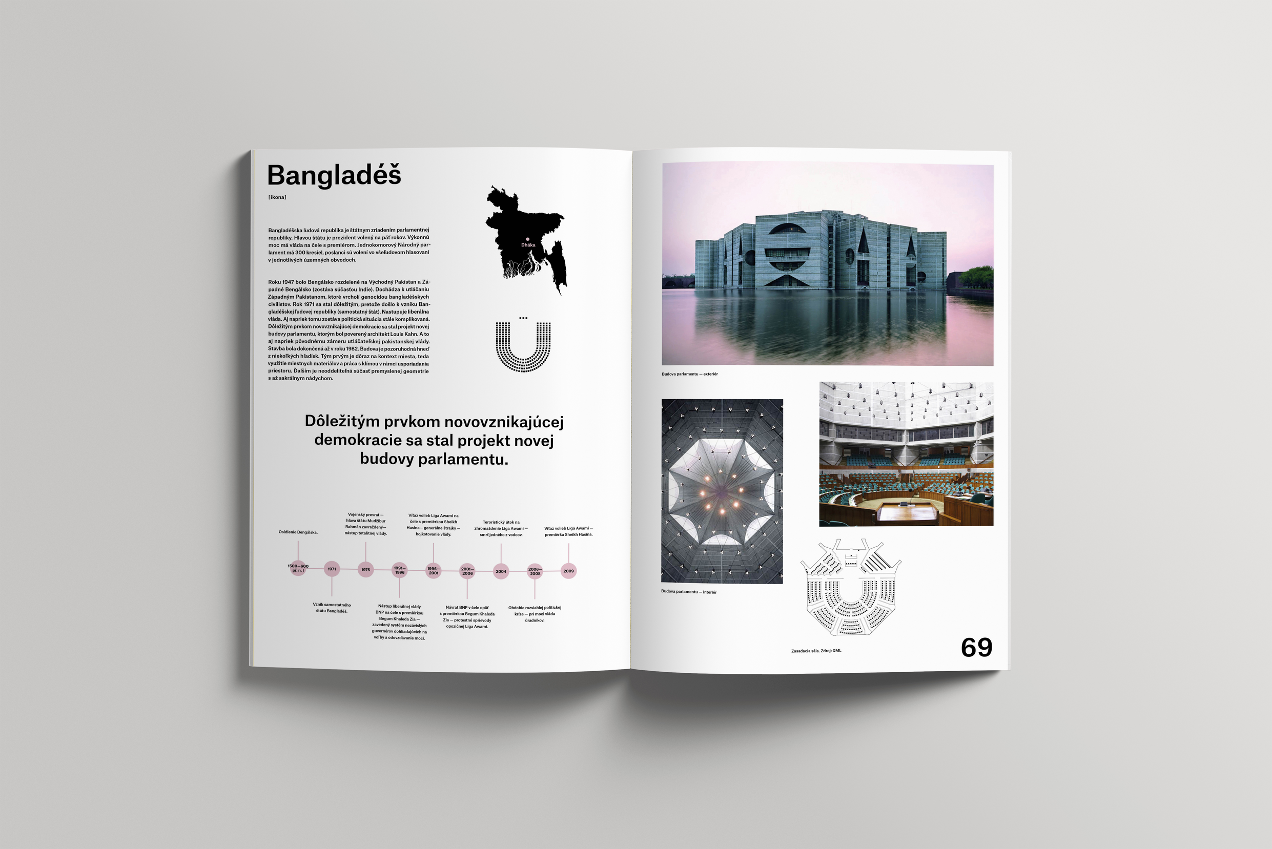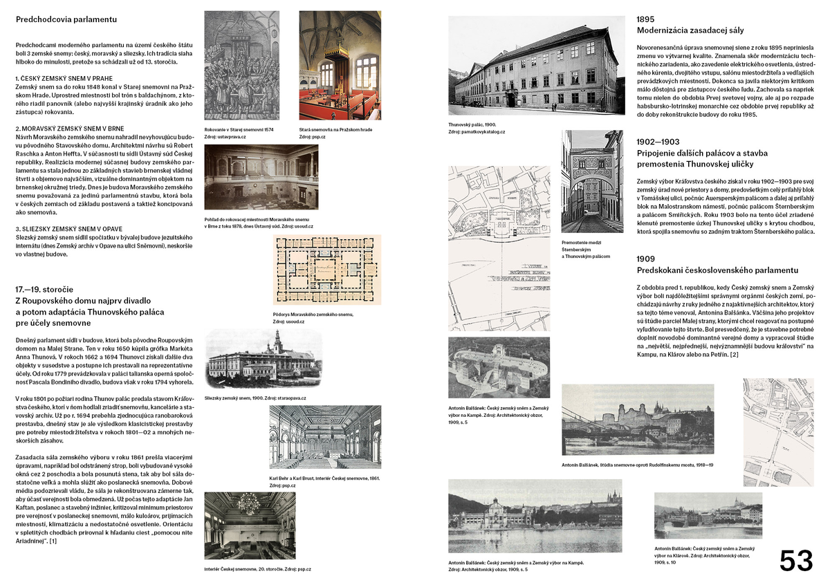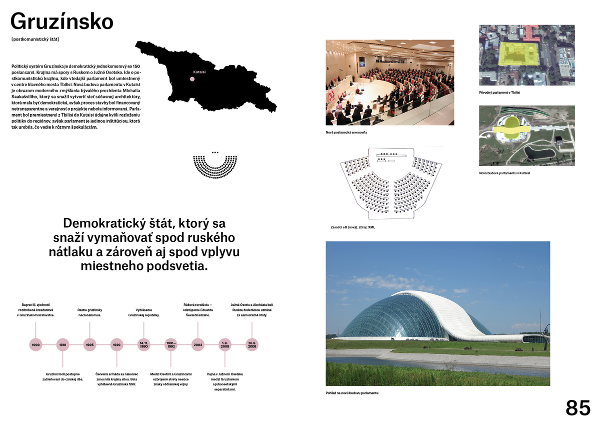 Kapitola Analýza zasadacích sál, miest a štátov - Čo je české na českom parlamente? približuje niekoľko vybraných štátov sveta a ich príbehy na ceste k demokratickému zriadeniu a budove parlamentu. Výber štátov prebiehal v dvoch kategóriách: ikony (slávné príklady ikonických parlamentných budov vo svete) a postkomunistické štáty (príbehy politicky bližšie ČR, ktoré otázku demokratického parlamentu riešili po páde komunizmu). Pri ich komparácii je možné hľadať odpoveď na otázku: "čo je české na českom parlamente?".