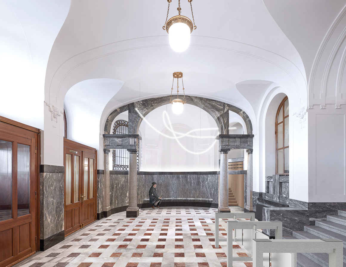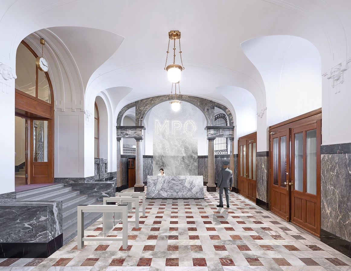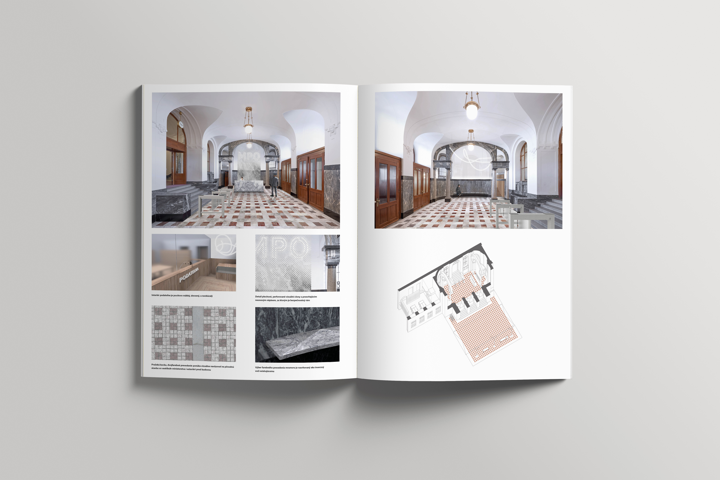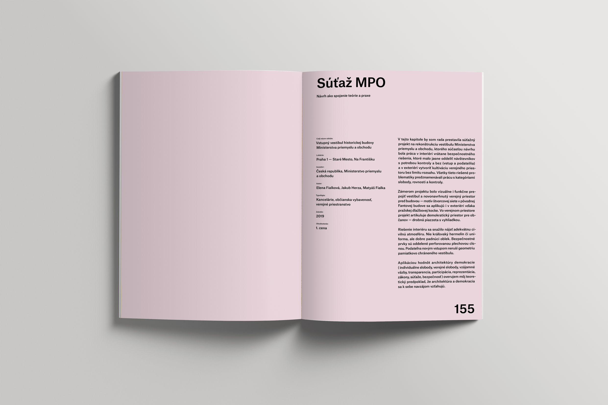 V kapitole Súťaž MPO - Návrh ako spojenie teórie a praxe predstavujem súťažný projekt na rekonštrukciu vestibulu Ministerstva priemyslu a obchodu v Prahe. Súčasťou návrhu bola práca v interiéri vrátane bezpečnostného riešenia, ktoré malo oddeliť návštevníkov s potrebou kontroly a bez (vstup a podatelňa). Existujúca štvorcová sieť vizuálne prepája vestibul a novovzniknutý verejný priestor pred budovou."Nie banka či hotel, ale jedno z ministerstiev demokratickej republiky. Nie kráľovský hermelín či uniforma, ale dobre padnúci oblek."