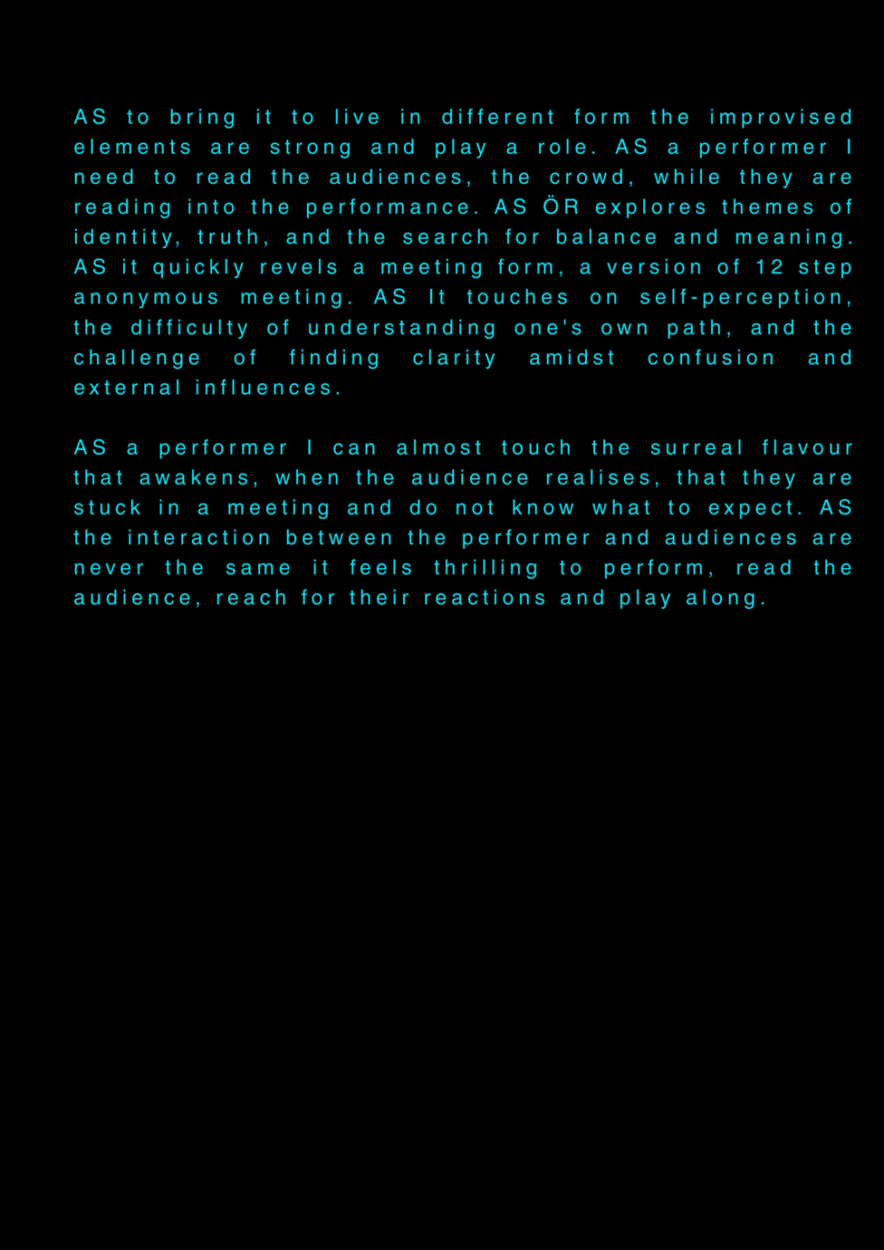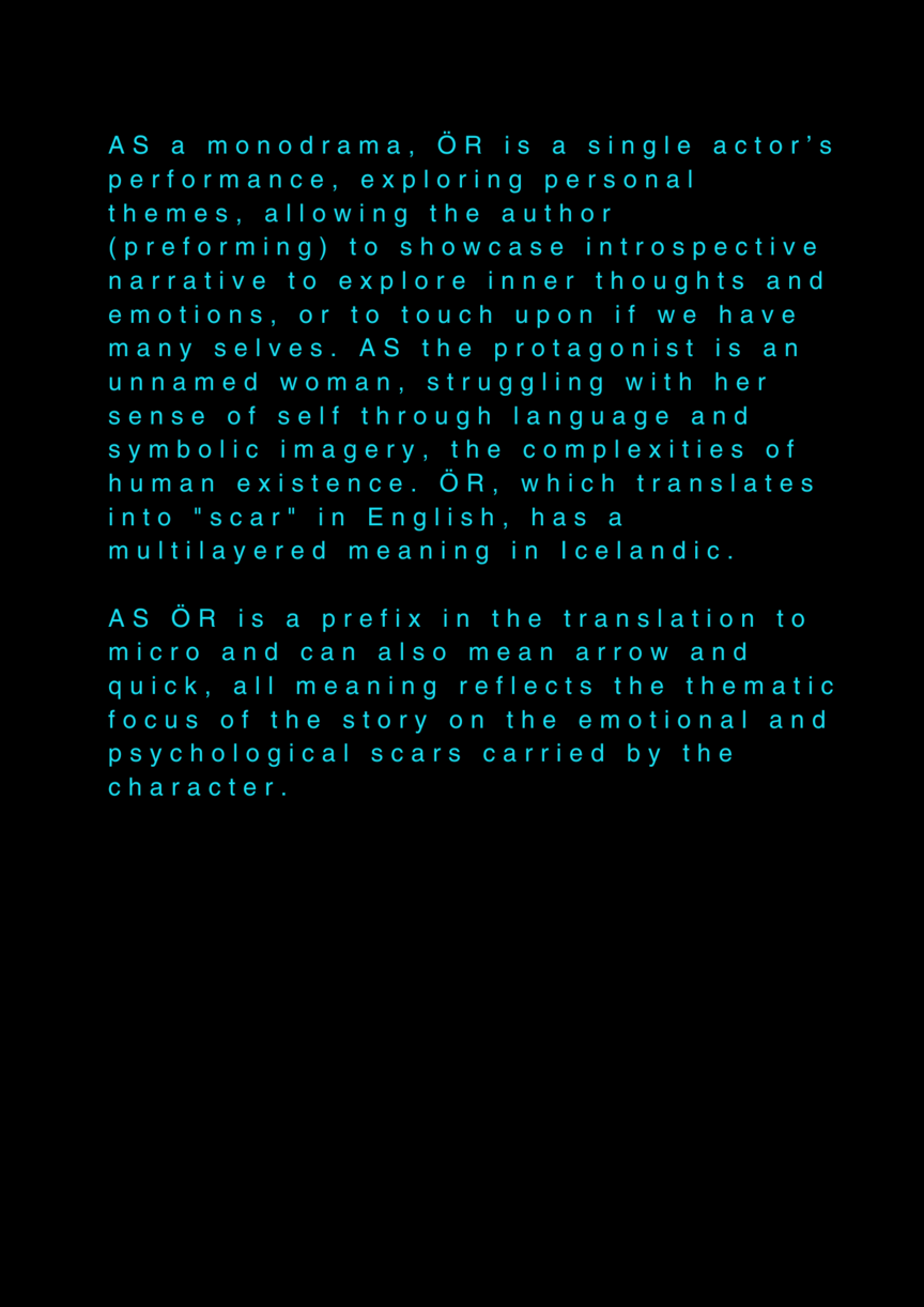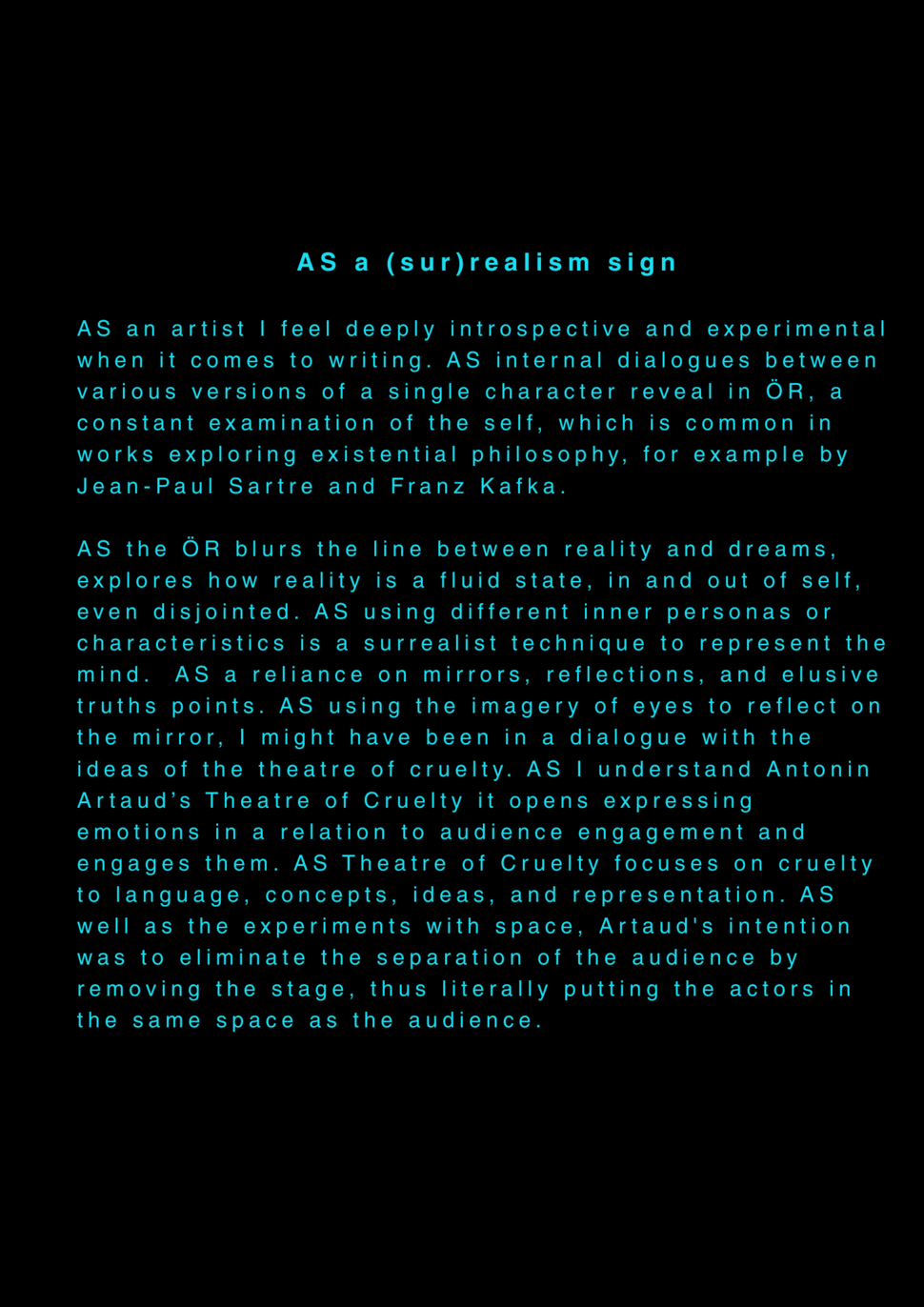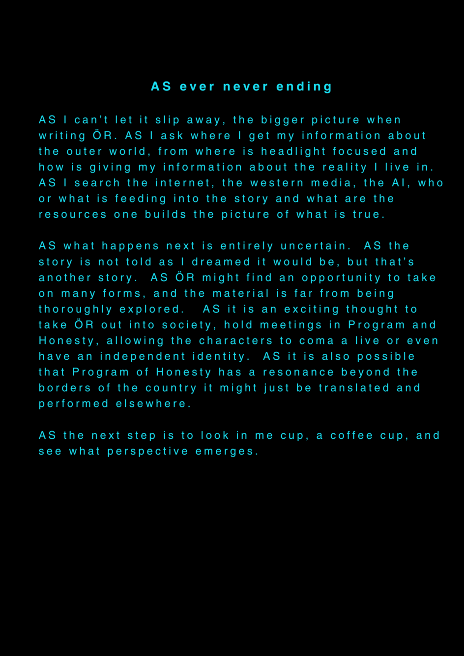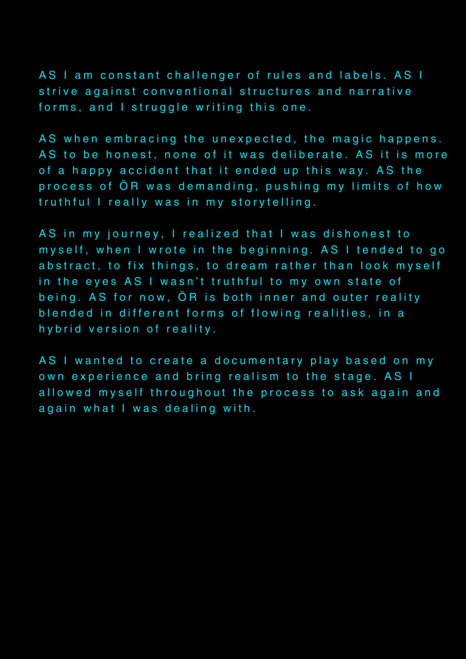 AS this is my final project about my final project at the University of the Arts in Iceland, it serves as a reflection on my own artistic process. AS I am completing my MA in Performing Arts, this moment signifies an ending, yet I feel I am still in the midst of processing it. AS I set out to create a documentary play rooted in personal experience, aiming to bring realism to the stage. AS I allowed myself throughout the process to repeatedly ask: what am I truly confronting? AS I came to realize that, in the beginning, I was not being honest with myself. AS I tended to lean toward abstraction, to fix things, to escape into dreams rather than meet myself with clarity. AS I was not truthful to my own state of being. AS a way to hold myself accountable, ÖR ultimately became a kind of encounter, with a meeting within a Program of Honesty. AS if ÖR blends inner and outer realities, flowing in a hybrid form of lived and performed experience. AS are my initials, it echos in my writings. AS an ongoing loop.