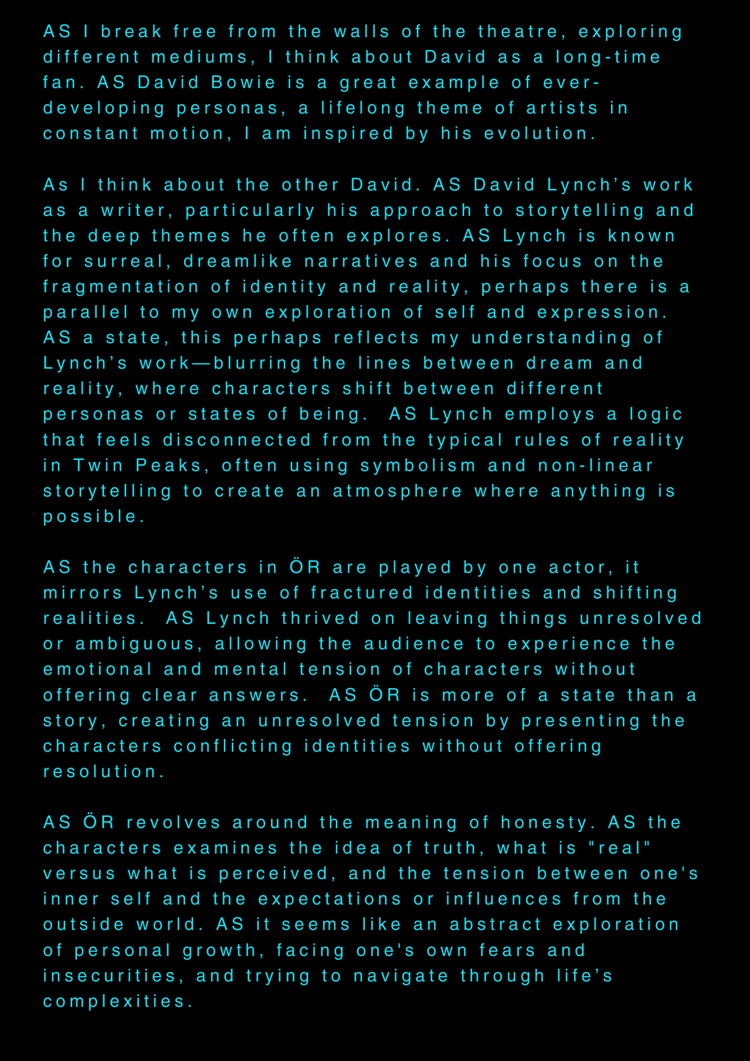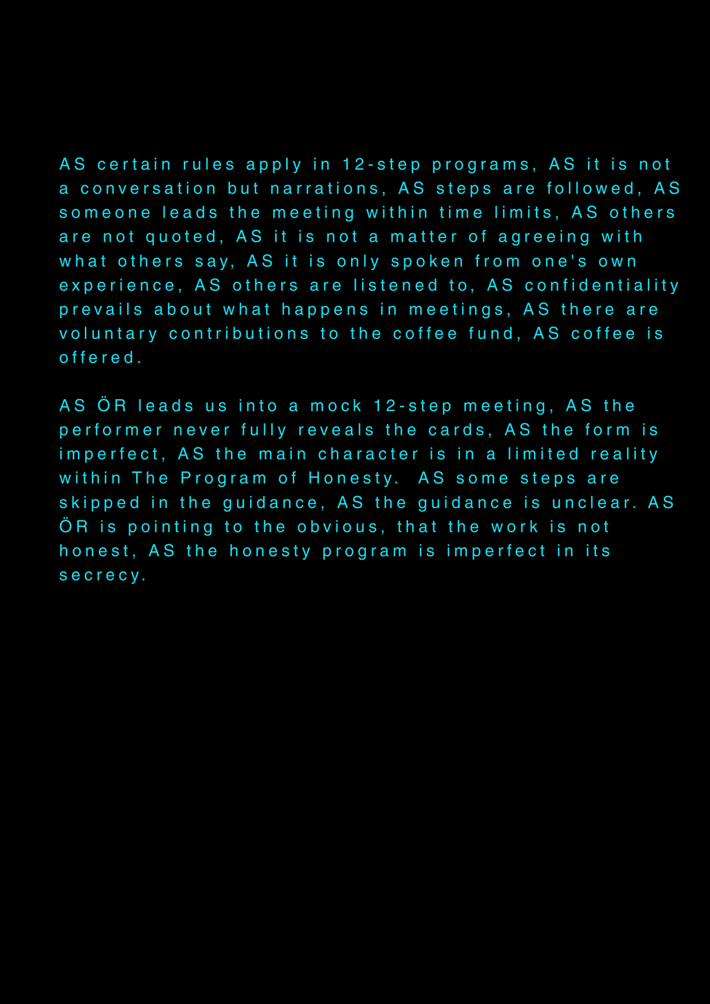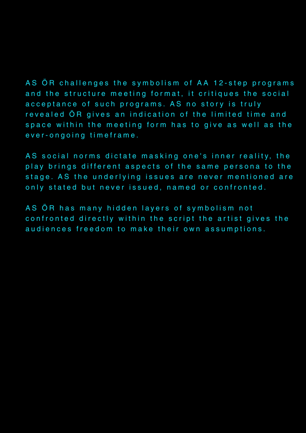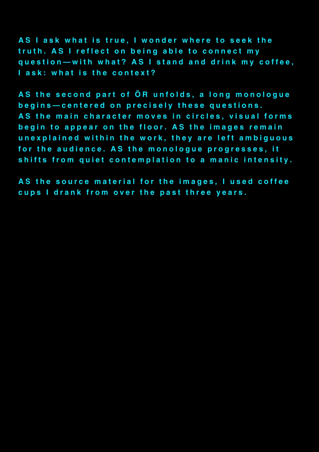 AS this is my final project about my final project at the University of the Arts in Iceland, it serves as a reflection on my own artistic process. AS I am completing my MA in Performing Arts, this moment signifies an ending, yet I feel I am still in the midst of processing it. AS I set out to create a documentary play rooted in personal experience, aiming to bring realism to the stage. AS I allowed myself throughout the process to repeatedly ask: what am I truly confronting? AS I came to realize that, in the beginning, I was not being honest with myself. AS I tended to lean toward abstraction, to fix things, to escape into dreams rather than meet myself with clarity. AS I was not truthful to my own state of being. AS a way to hold myself accountable, ÖR ultimately became a kind of encounter, with a meeting within a Program of Honesty. AS if ÖR blends inner and outer realities, flowing in a hybrid form of lived and performed experience. AS are my initials, it echos in my writings. AS an ongoing loop.