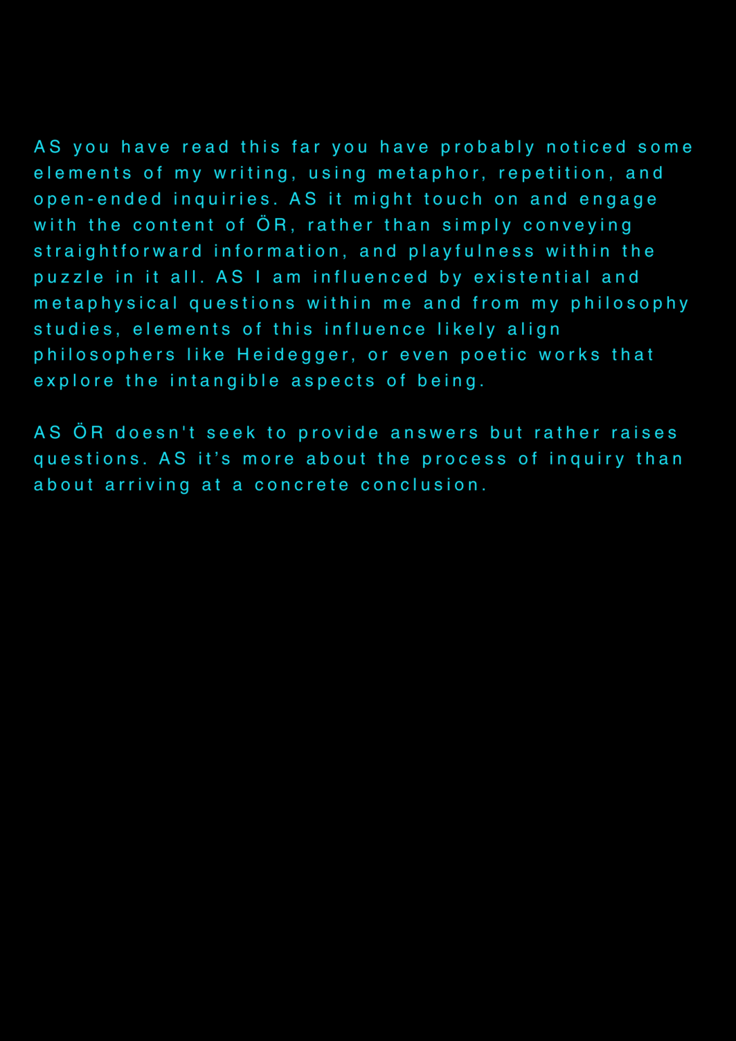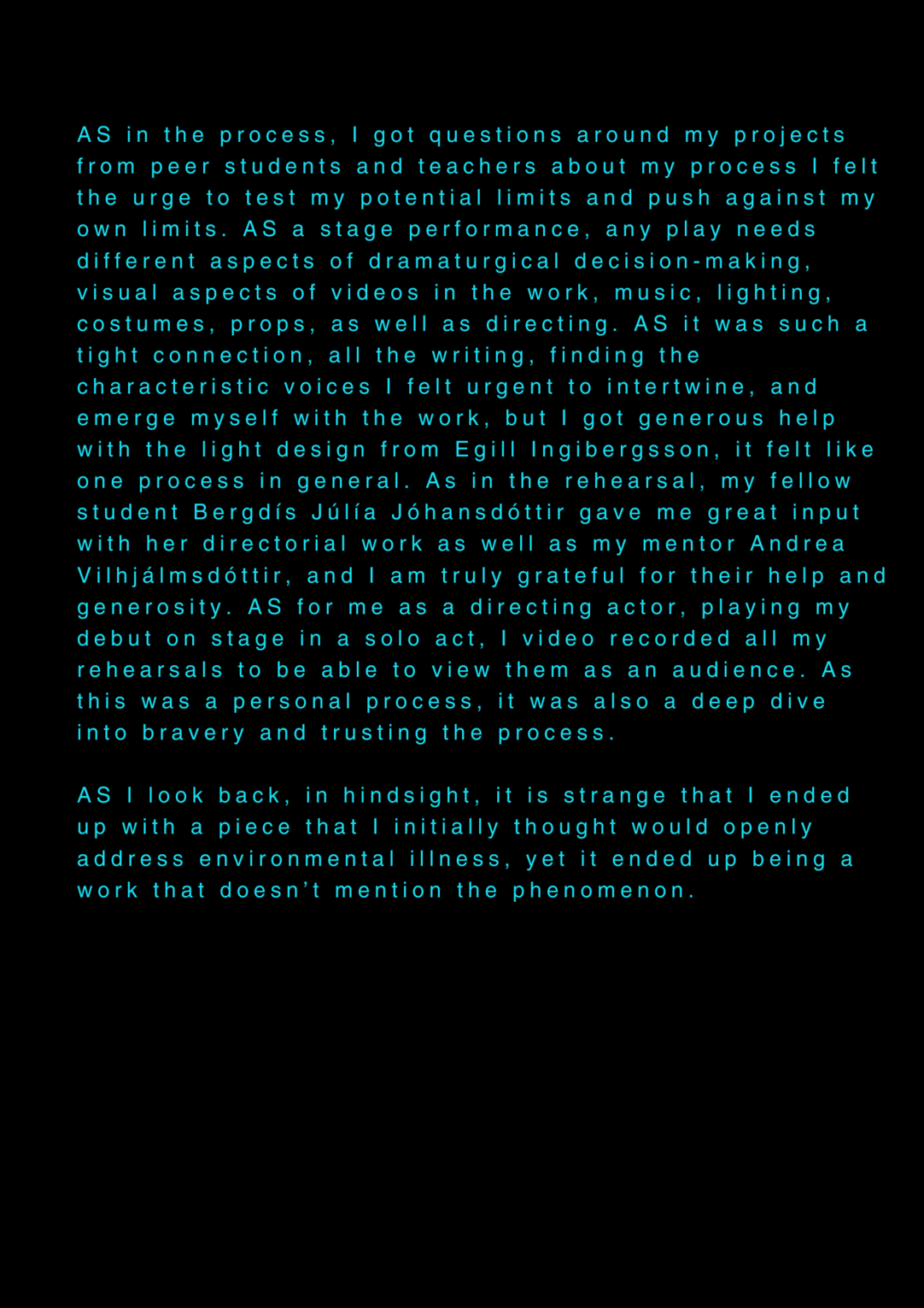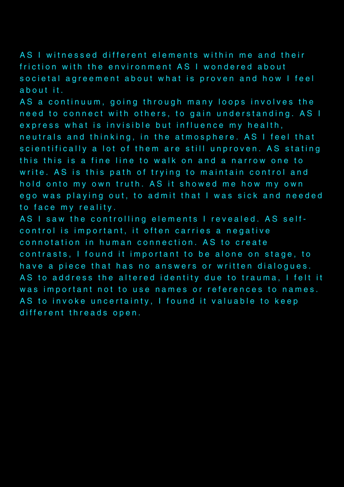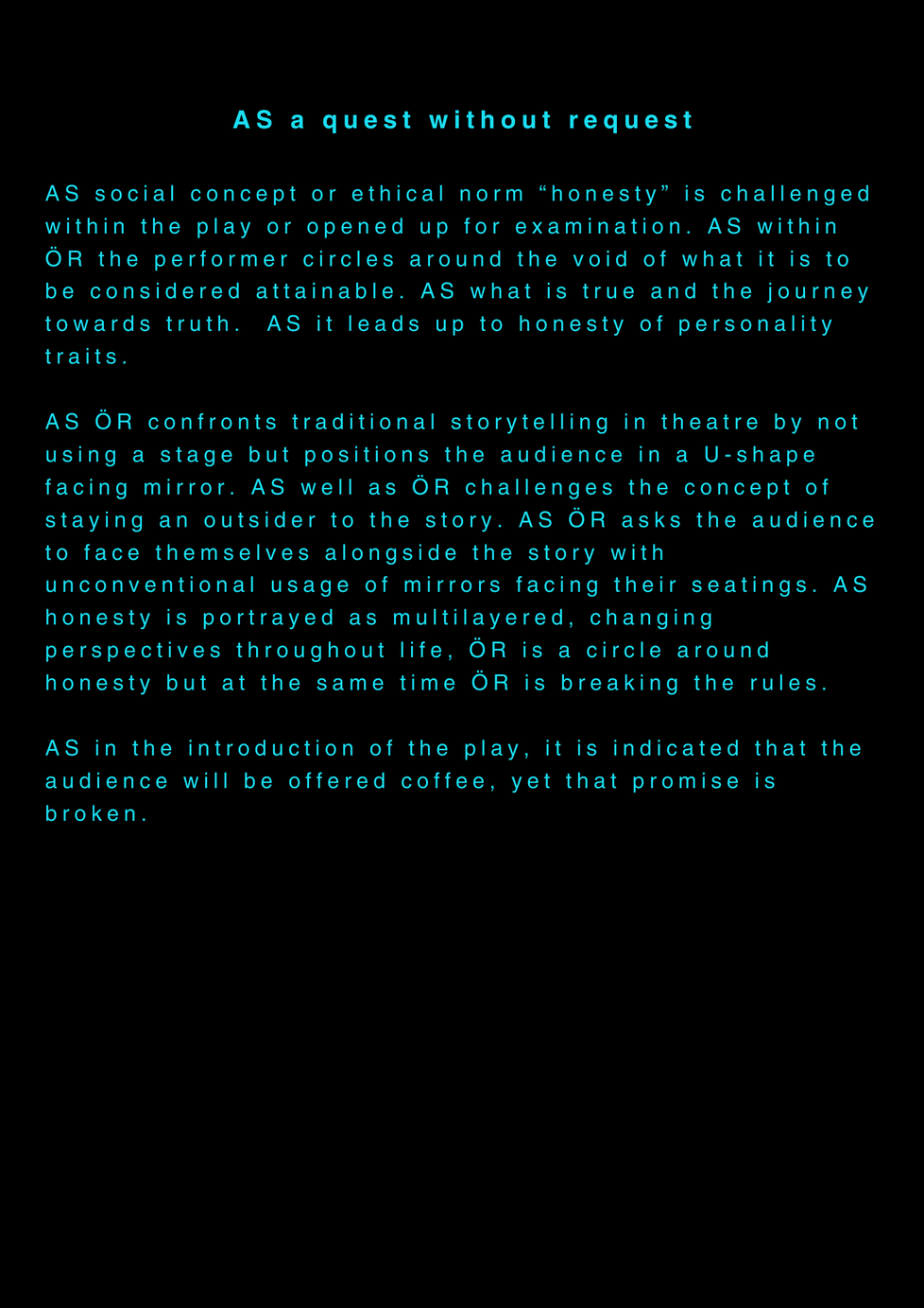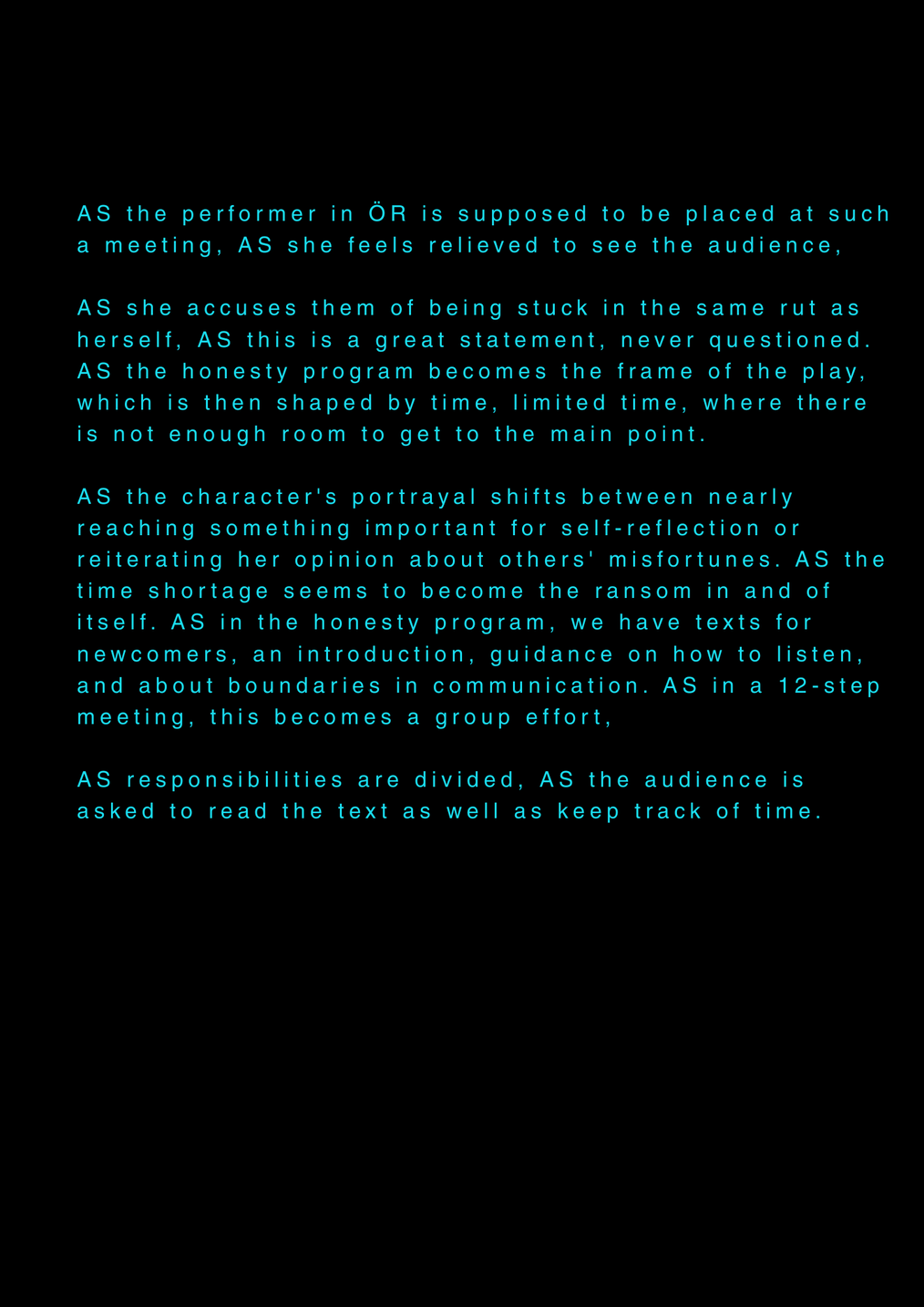 AS this is my final project about my final project at the University of the Arts in Iceland, it serves as a reflection on my own artistic process. AS I am completing my MA in Performing Arts, this moment signifies an ending, yet I feel I am still in the midst of processing it. AS I set out to create a documentary play rooted in personal experience, aiming to bring realism to the stage. AS I allowed myself throughout the process to repeatedly ask: what am I truly confronting? AS I came to realize that, in the beginning, I was not being honest with myself. AS I tended to lean toward abstraction, to fix things, to escape into dreams rather than meet myself with clarity. AS I was not truthful to my own state of being. AS a way to hold myself accountable, ÖR ultimately became a kind of encounter, with a meeting within a Program of Honesty. AS if ÖR blends inner and outer realities, flowing in a hybrid form of lived and performed experience. AS are my initials, it echos in my writings. AS an ongoing loop.