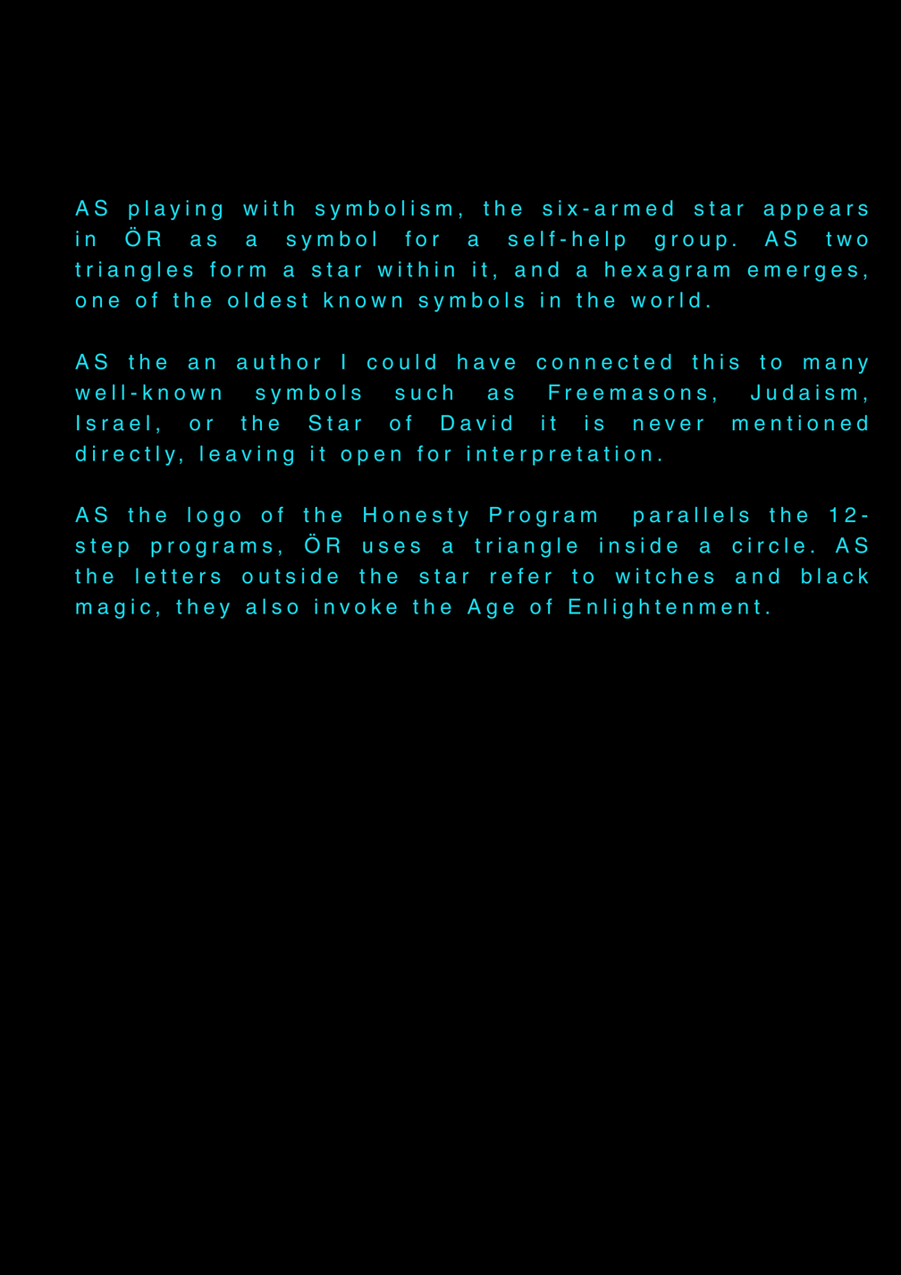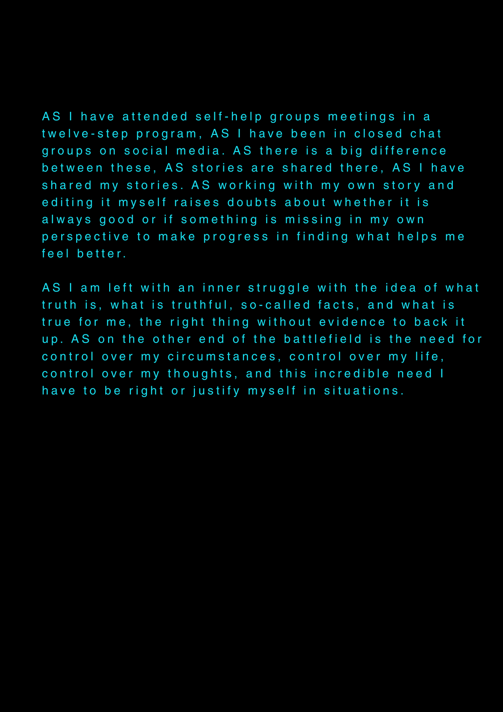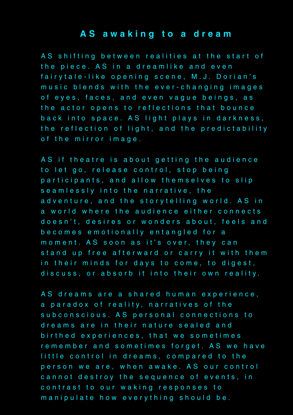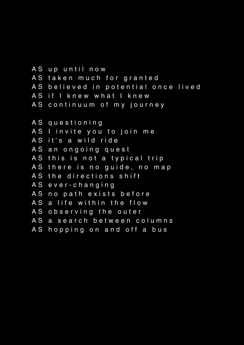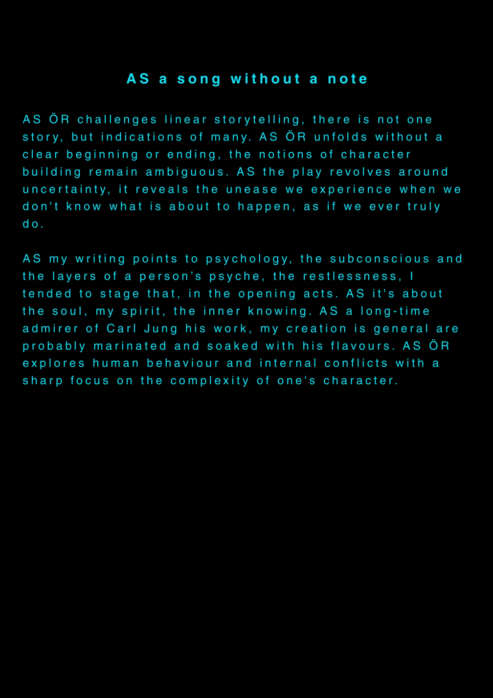 AS this is my final project about my final project at the University of the Arts in Iceland, it serves as a reflection on my own artistic process. AS I am completing my MA in Performing Arts, this moment signifies an ending, yet I feel I am still in the midst of processing it. AS I set out to create a documentary play rooted in personal experience, aiming to bring realism to the stage. AS I allowed myself throughout the process to repeatedly ask: what am I truly confronting? AS I came to realize that, in the beginning, I was not being honest with myself. AS I tended to lean toward abstraction, to fix things, to escape into dreams rather than meet myself with clarity. AS I was not truthful to my own state of being. AS a way to hold myself accountable, ÖR ultimately became a kind of encounter, with a meeting within a Program of Honesty. AS if ÖR blends inner and outer realities, flowing in a hybrid form of lived and performed experience. AS are my initials, it echos in my writings. AS an ongoing loop.