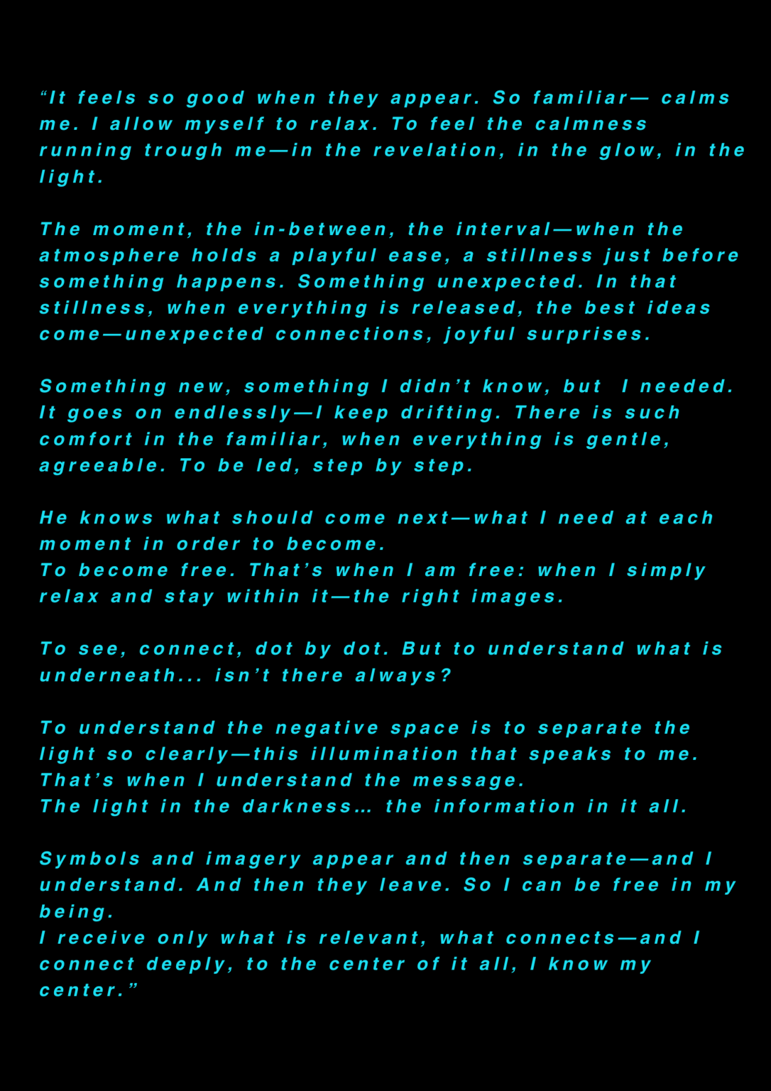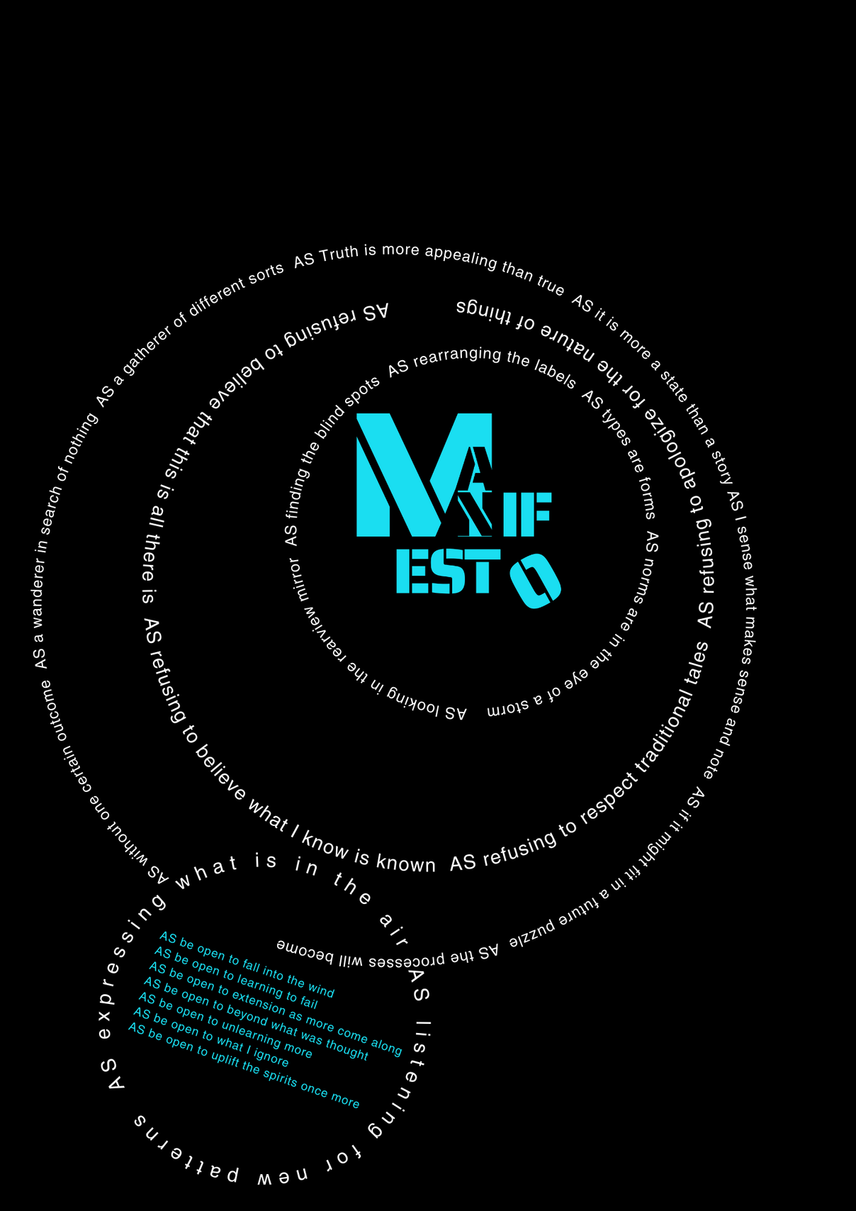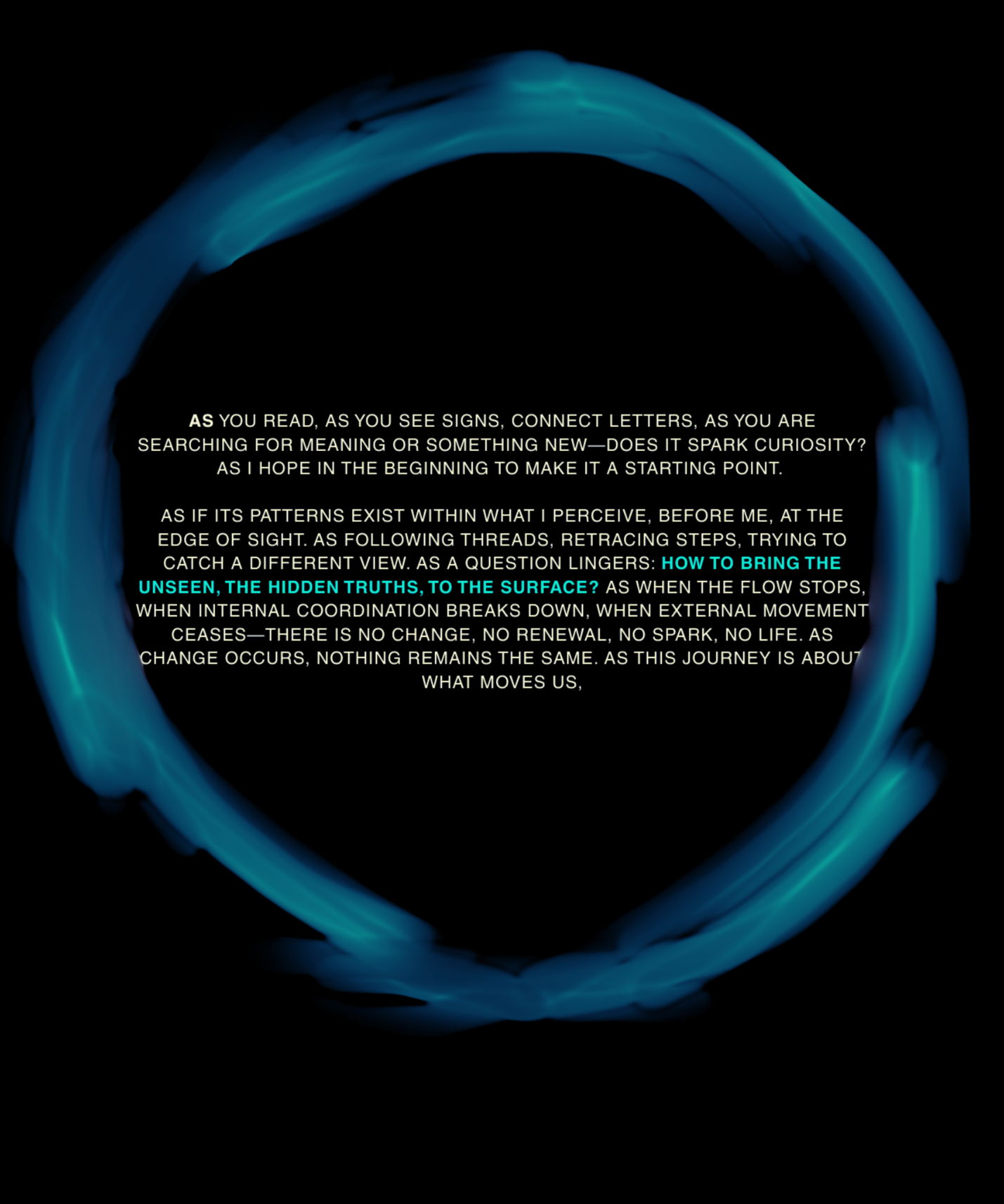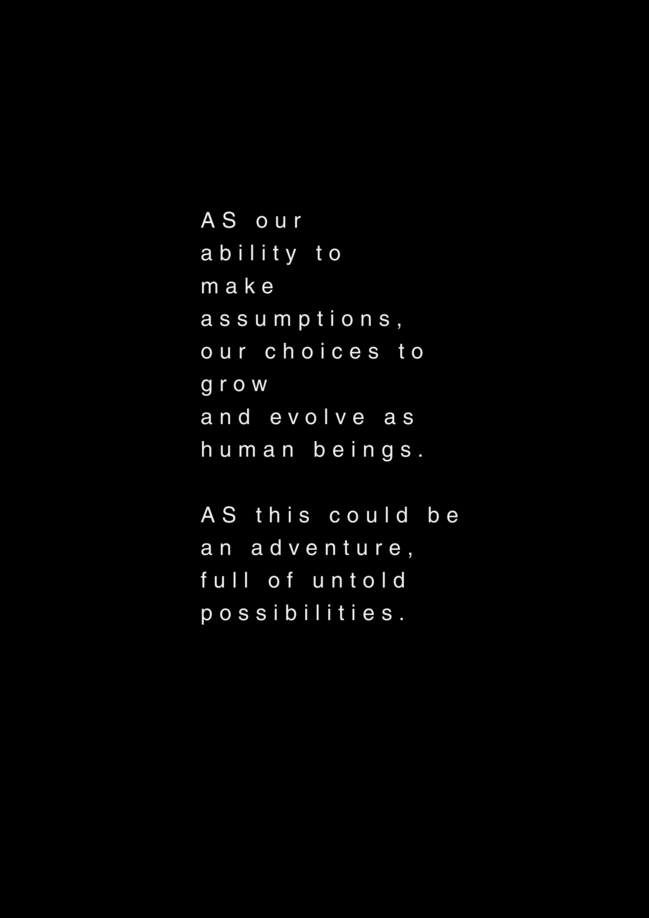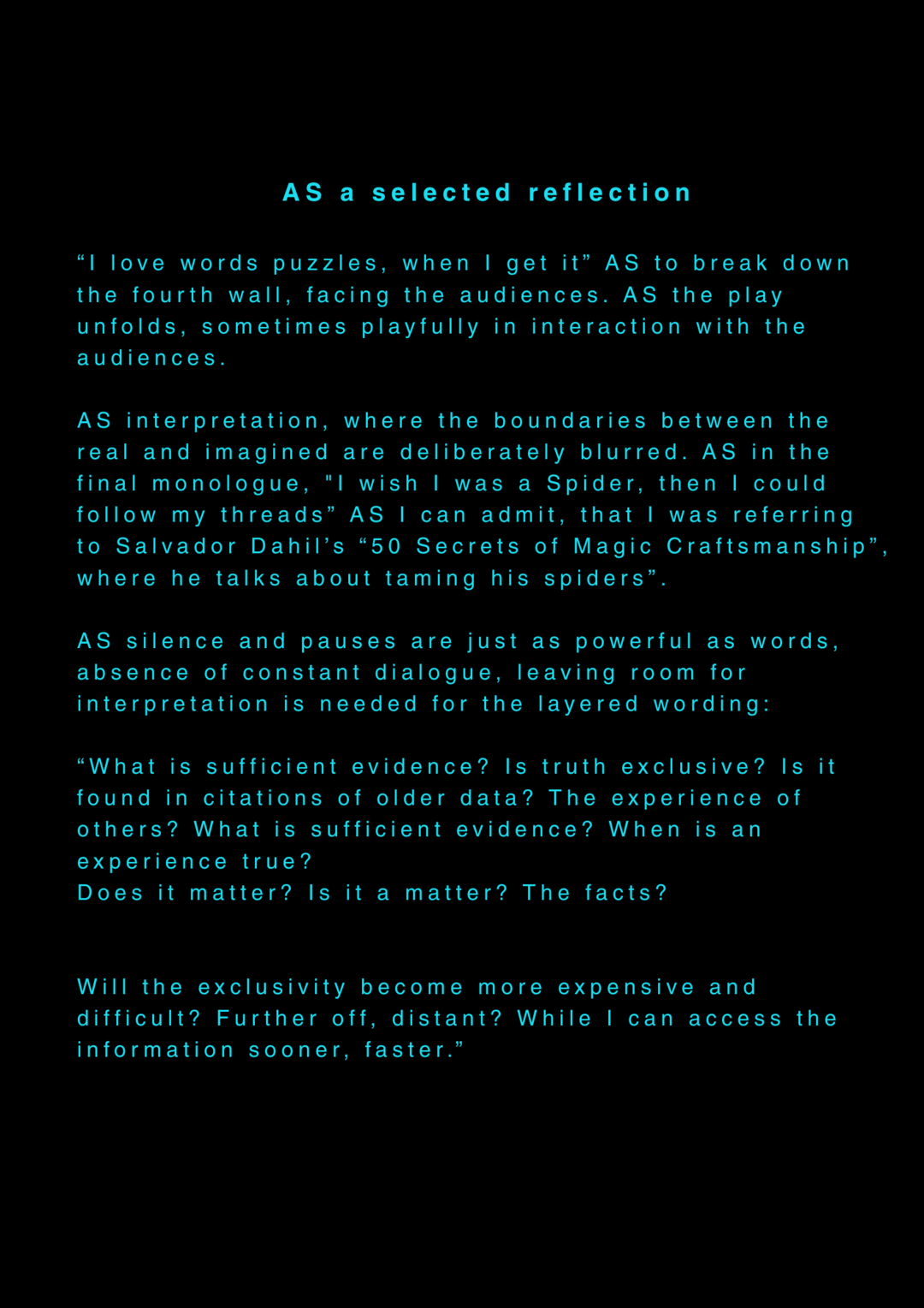 AS this is my final project about my final project at the University of the Arts in Iceland, it serves as a reflection on my own artistic process. AS I am completing my MA in Performing Arts, this moment signifies an ending, yet I feel I am still in the midst of processing it. AS I set out to create a documentary play rooted in personal experience, aiming to bring realism to the stage. AS I allowed myself throughout the process to repeatedly ask: what am I truly confronting? AS I came to realize that, in the beginning, I was not being honest with myself. AS I tended to lean toward abstraction, to fix things, to escape into dreams rather than meet myself with clarity. AS I was not truthful to my own state of being. AS a way to hold myself accountable, ÖR ultimately became a kind of encounter, with a meeting within a Program of Honesty. AS if ÖR blends inner and outer realities, flowing in a hybrid form of lived and performed experience. AS are my initials, it echos in my writings. AS an ongoing loop.