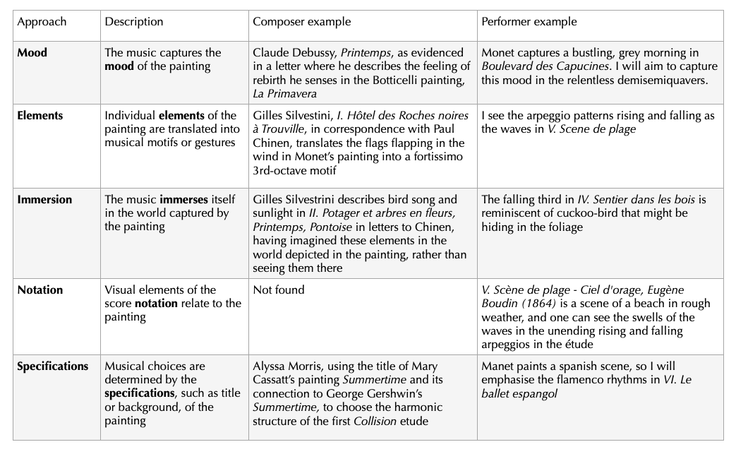 This research has been instrumental in shaping my understanding of how music can be both inspired by and respond to visual art, offering new frameworks for composers and performers alike. By exploring various approaches to translating visual art into music, this study underscores the importance of individual interpretation in the creative process, particularly for performers. Future applications of this study could involve applying the framework of five approaches to more repertoire inspired by visual art, to discover whether it is broadly applicable and whether more approaches need to be considered.