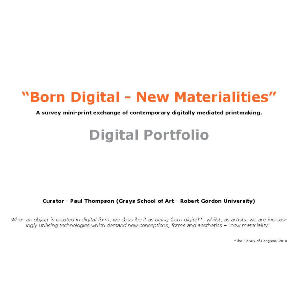 The ‘Born Digital – New materialities’ print portfolio is the result of an open call ‘exchange’ survey, examining the notion of ‘printmaking 2.0’. It is part of research examining the physical and temporal parameters of post-studio print making practice through the exploration and application of digital processes in making and cultural shifts in digital participation, being undertaken by the curator/researcher at Grays School of Art – Robert Gordon University.