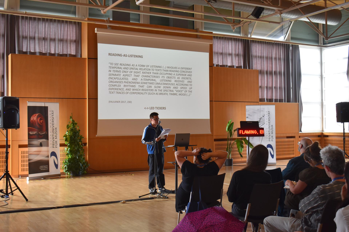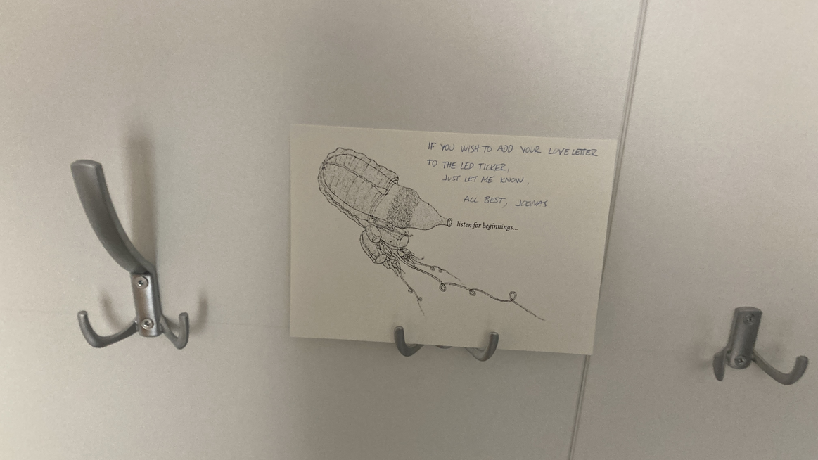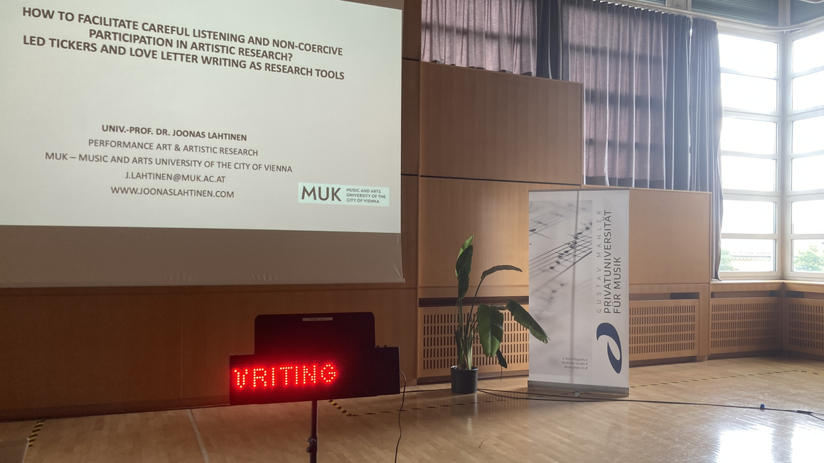 In this lecture performance, I introduce and outline productive possibilities that LED ticker displays and love letter writing can offer for facilitating careful listening and non-coercive participation in artistic research, and in research-driven artistic practice. Briefly put, by the term “careful listening” in this context, I refer to modes of listening that are attentive to the contents of what is being said, but that also allow for and encourage the reflection of the subjective and “intra-active” (Barad) dimensions inherent in, and the material-performative and situated conditions of, listening. The term “non-coercive participation”, for its part, refers here to participative art-based practices that are careful – or caring – in the sense that they leave room for different modes or “degrees” of participation, and in that they aim to take the potential processes of exclusion and coercion rooted in the practical decisions and material circumstances regarding the devising and realization of the given project into account. Operating on the premiss that reading can be considered as a form of listening and attending to the text and its contents (Boulous Walker), and drawing on two recent endeavours I was part of in different yet cross-pollinating roles – as an advisor and collaborator in the artistic research project ‘Tactics for a Collective Body’ (AP Arts Antwerp, 2020–22), and as the artist-initiator of the installation ‘Love Letters’ in public space (Kunstzelle, WUK Vienna, 2023–24) – I discuss and present, first, ways in which love letter writing can function as a tool for – or mode of – careful listening, thereby fostering democratic and attentive dialogue between investigators within the frames of an artistic research project, and as a tool for offering a caring and accessible starting point for non-coercive participatory art practice. Secondly, I aim to show how the use of seemingly simple LED ticker displays can promote careful listening and non-coercive participation both in research workshops, showings, and artistic practice while, in the Rancièrean sense, also making the material-performative, “intra-active”, situated and auditive qualities of text and reading visible and sensible.