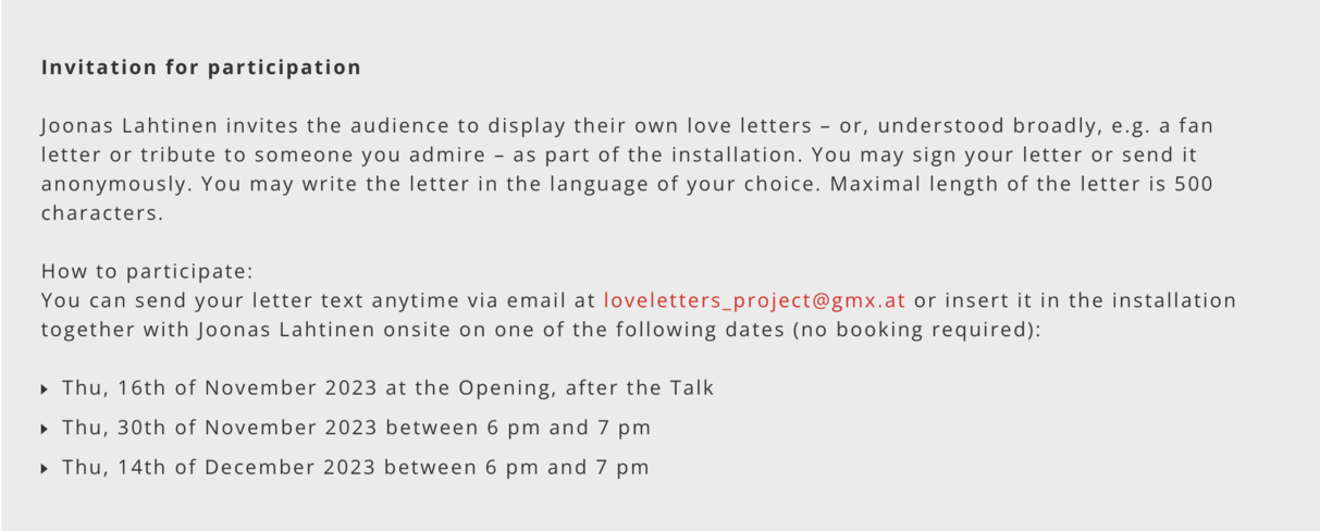 The Opening of LOVE LETTERS in the Kunstzelle included a talk between the cultural theorist, curator and Professor Elke Krasny and Joonas Lahtinen on art historical, cultural and sociopolitical contexts of love letters and of letter writing, the “confessional society”, politics of participatory art, and the relation between the “public” and the “private”, based on the installation. After the talk, the first love letters and messages by visitors were integrated into the installation.
