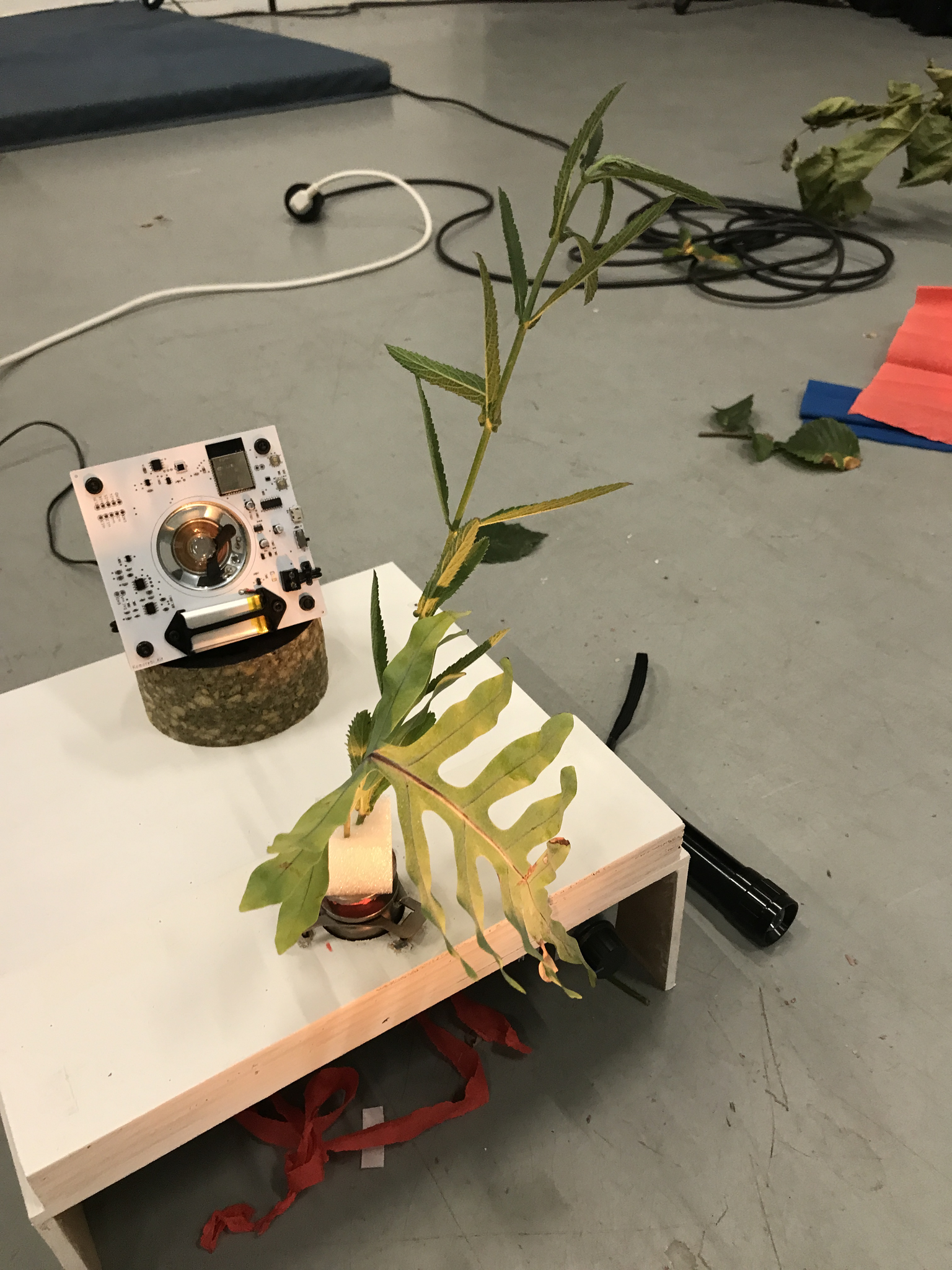 Additionally, in my piece "Pressure Tree" (2023), I expanded on the idea of the oscillator, but this time without using light. Instead, I replaced the photoresistor with two open cables, cutting the ends to expose the wires, which I used as brushes on an A1-sized paper to create a painting. The method works by using the conductivity of the ink and water on the paper, which is picked up by the two brushes, to determine the pitch of the oscillator. This creates a unique interaction between the visual art and the sound, making the oscillator's pitch change based on the conductivity of the materials on the paper. This approach showcases how the concept of the oscillator can be adapted and expanded in creative and unconventional ways.