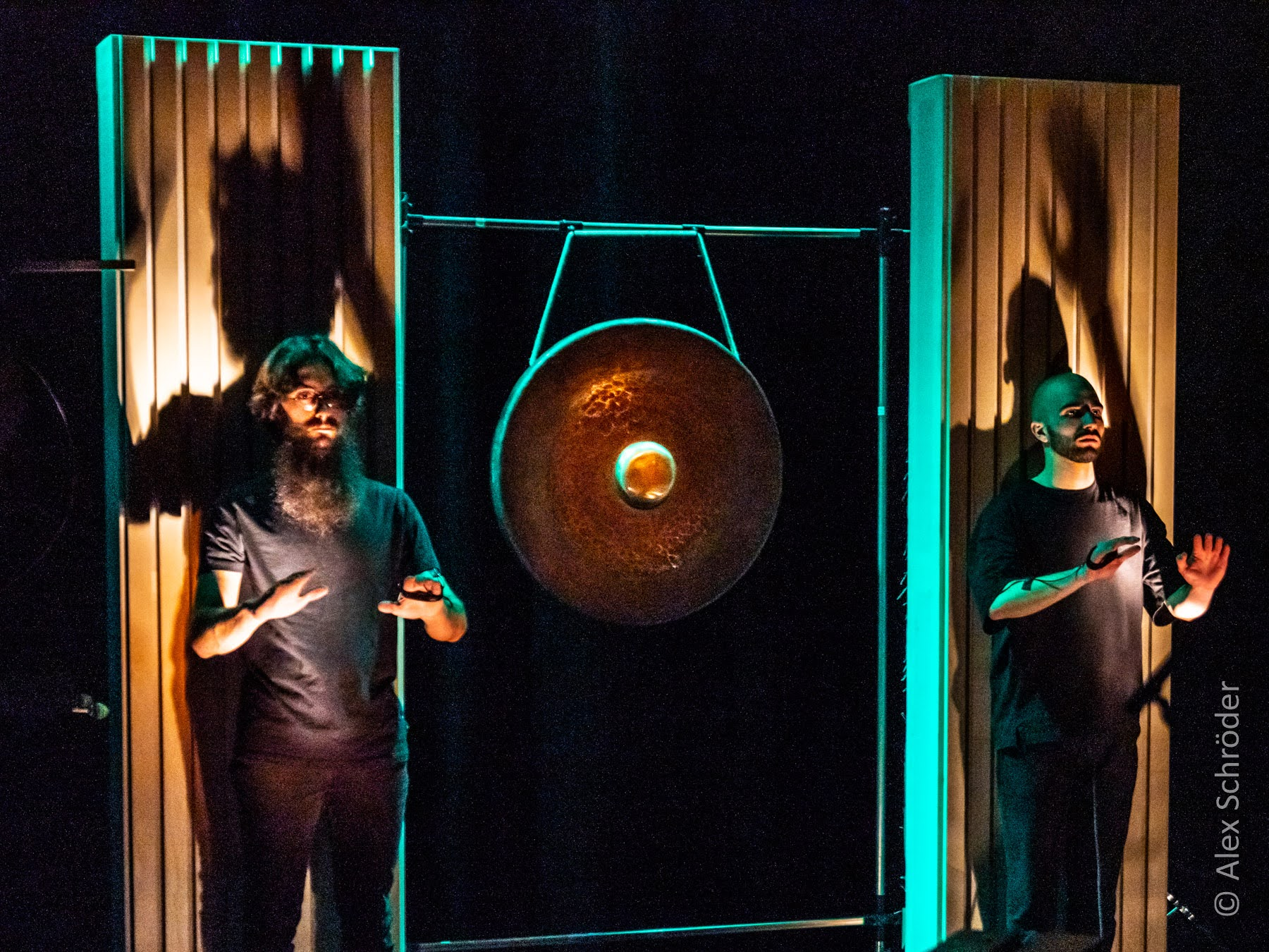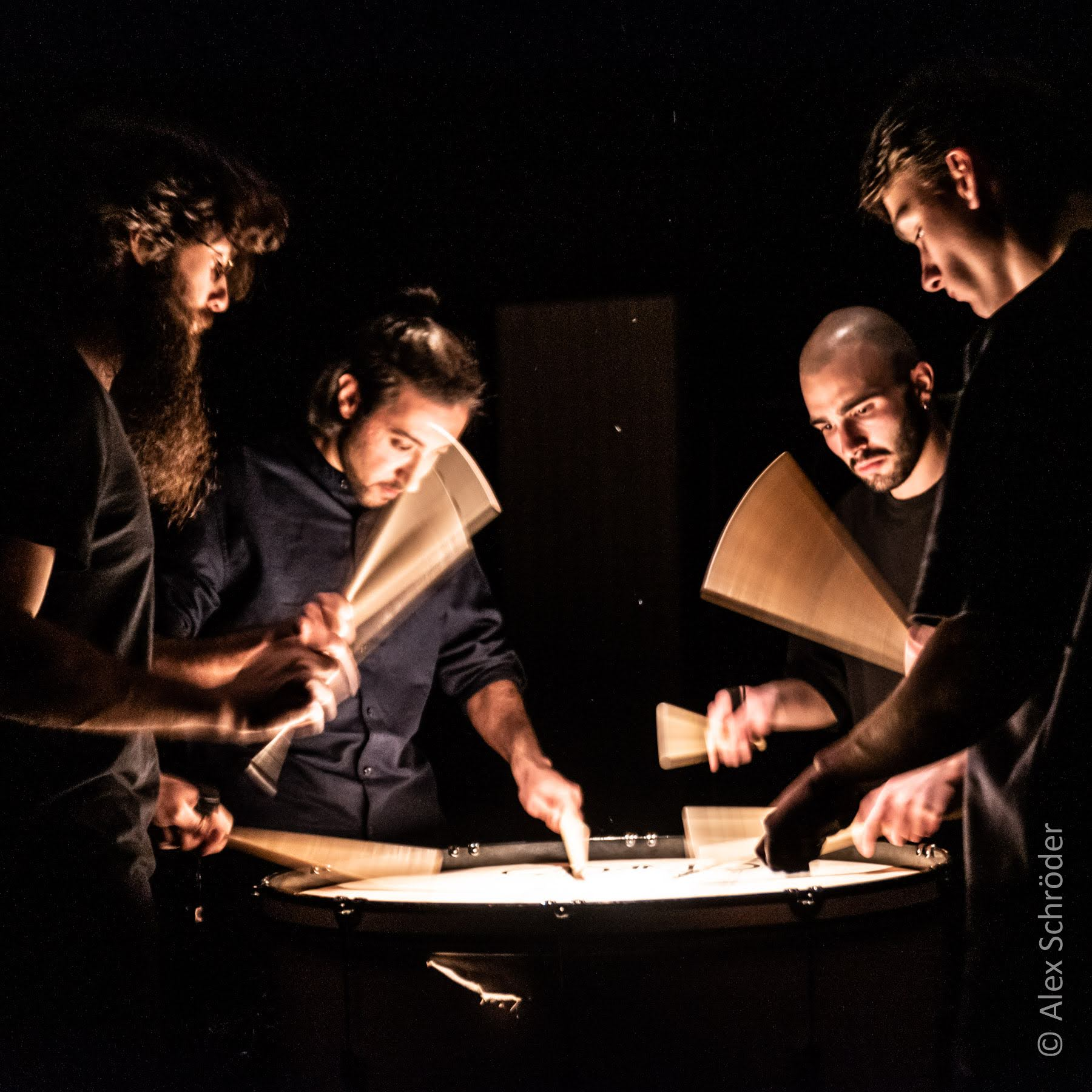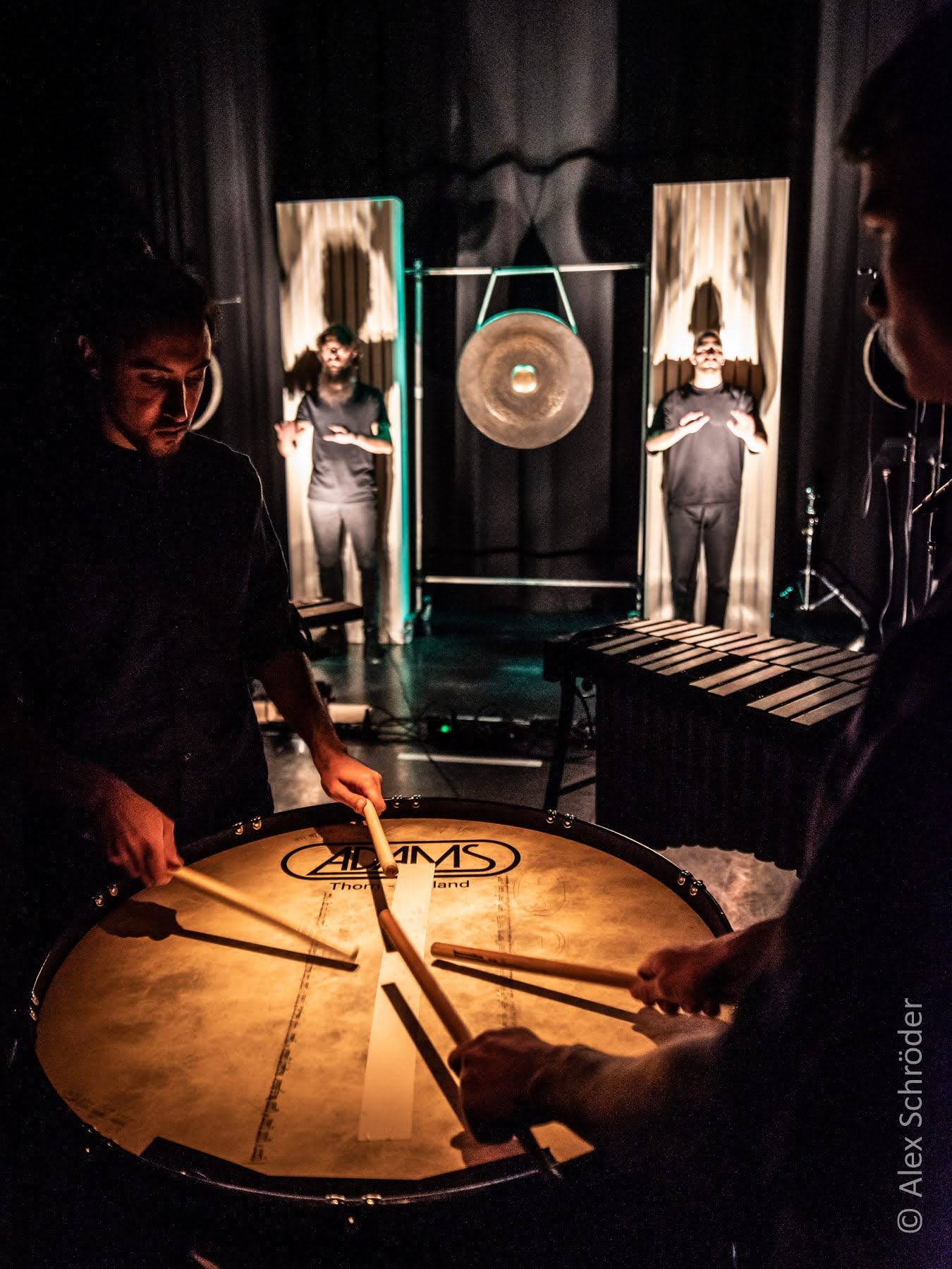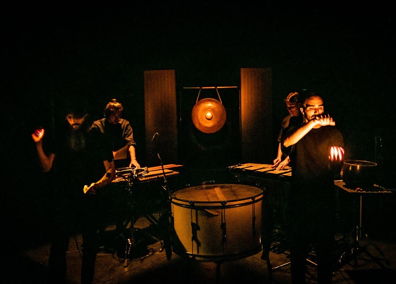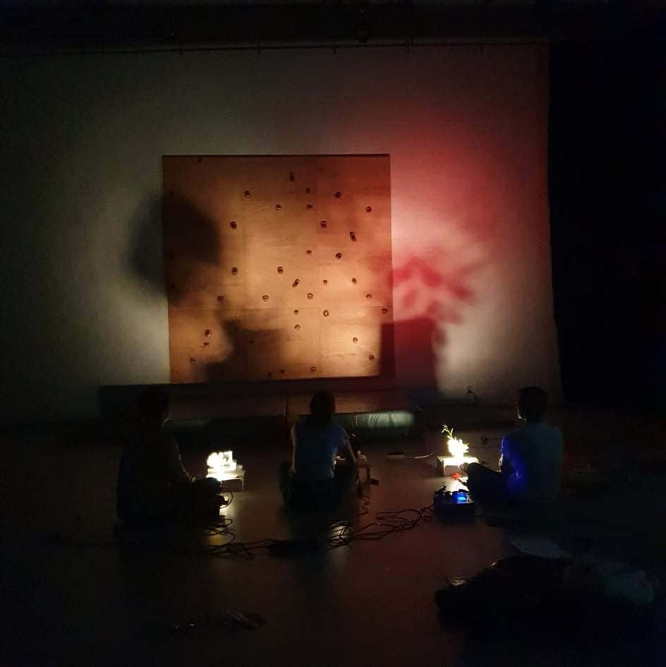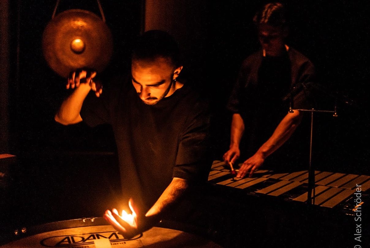 The setup included a bass drum skin suspended vertically on a large tam-tam frame, acting as a screen for shadow play. A contact microphone attached to the bottom captured the sound of hands striking the drum skin. The piece is divided into three parts. The first introduces the performers’ faces and hand gestures with alternating light on and off, creating a mysterious visual atmosphere without sound. In the second part, the performers begin to produce rhythms and patterns by striking the drum skin, guided by choreographed movements. The final section adds a second layer of blue light, representing the moon, as the sound is enriched with live electronic effects and a photoresistor-connected oscillator, generating raw, textured sounds.